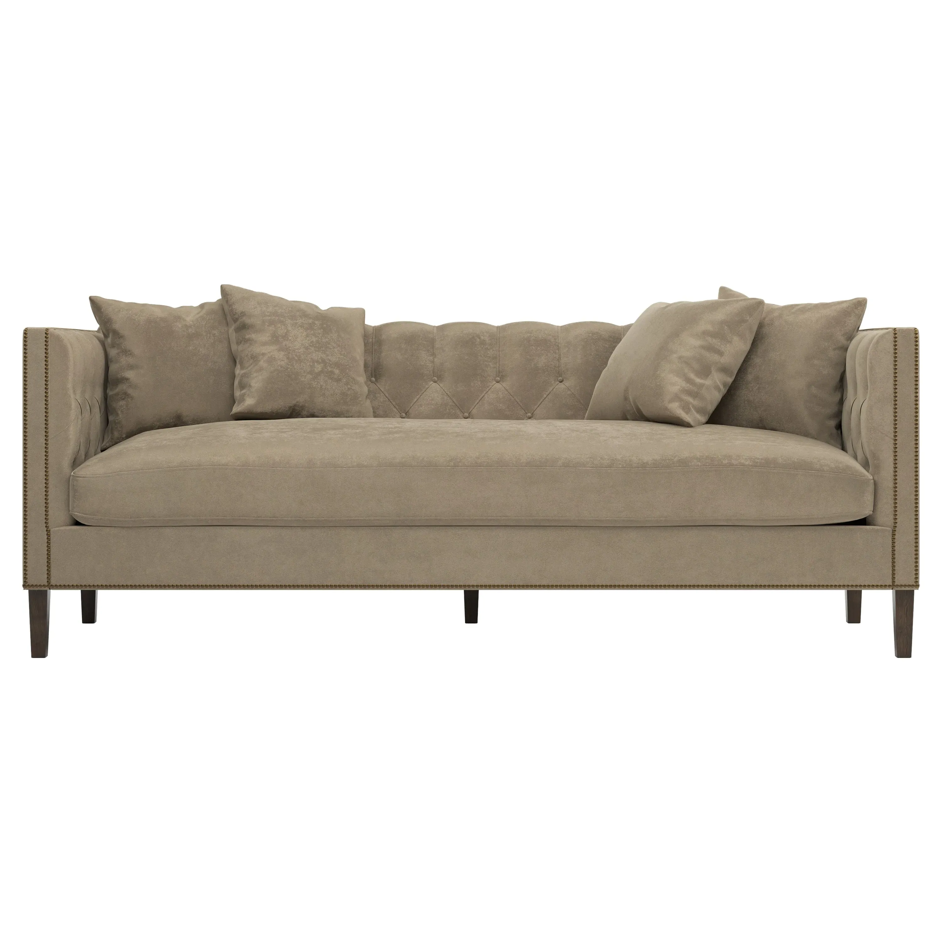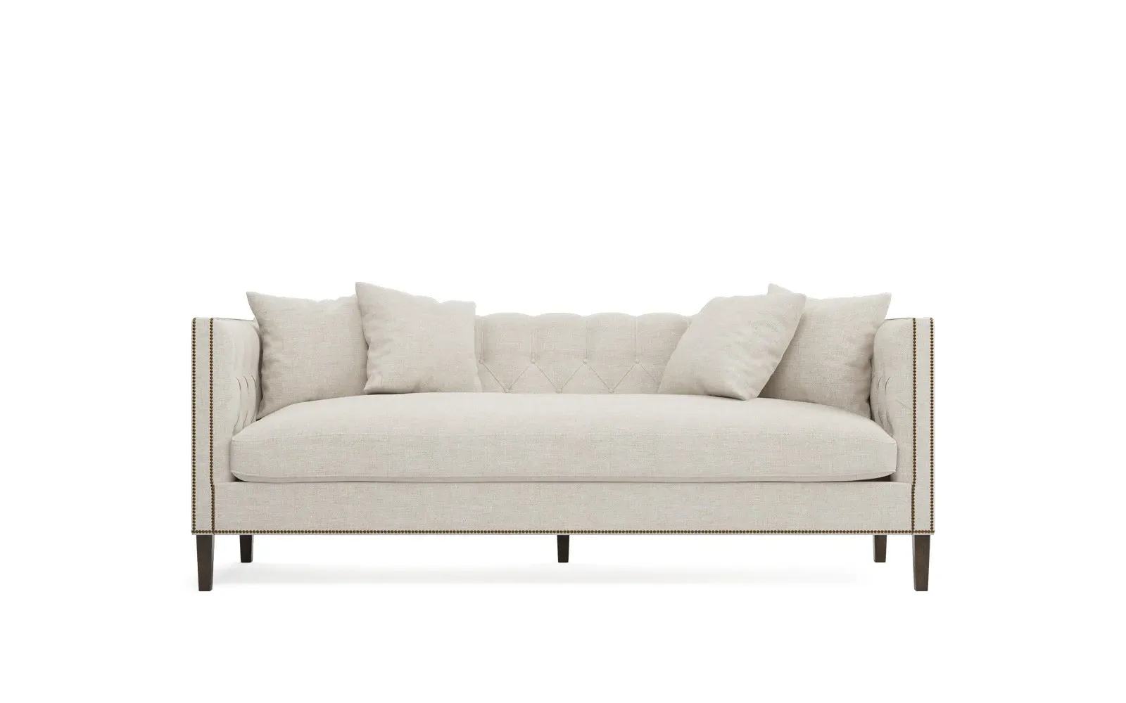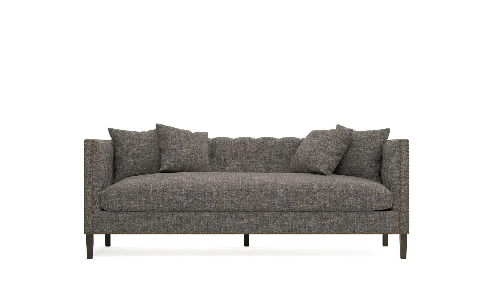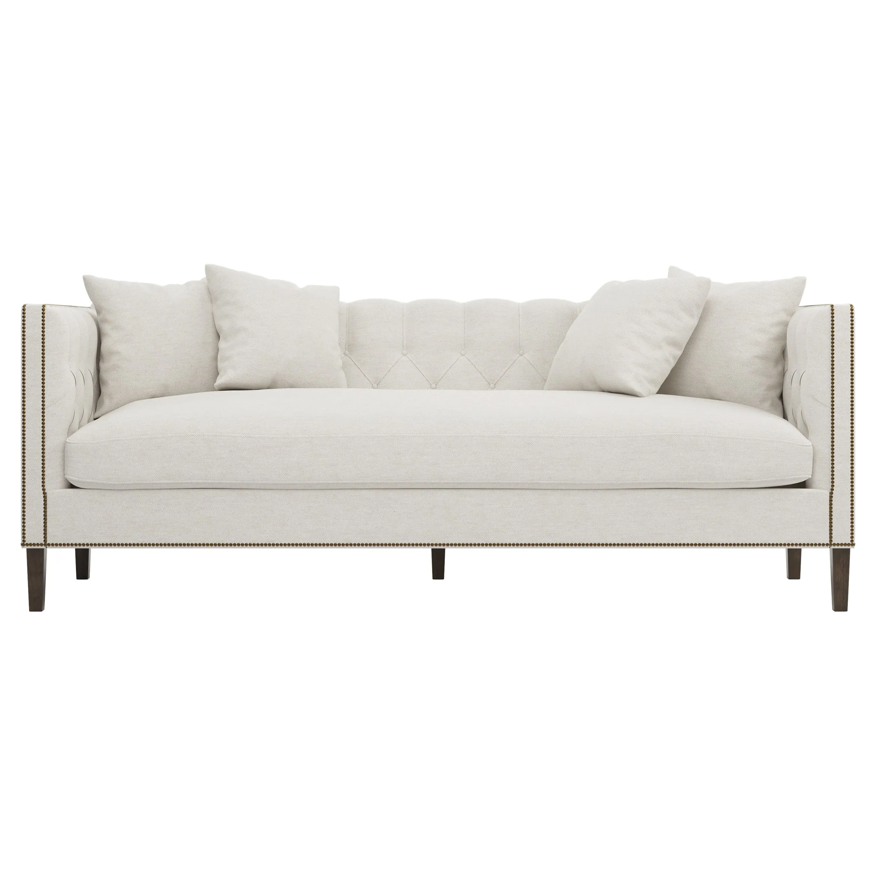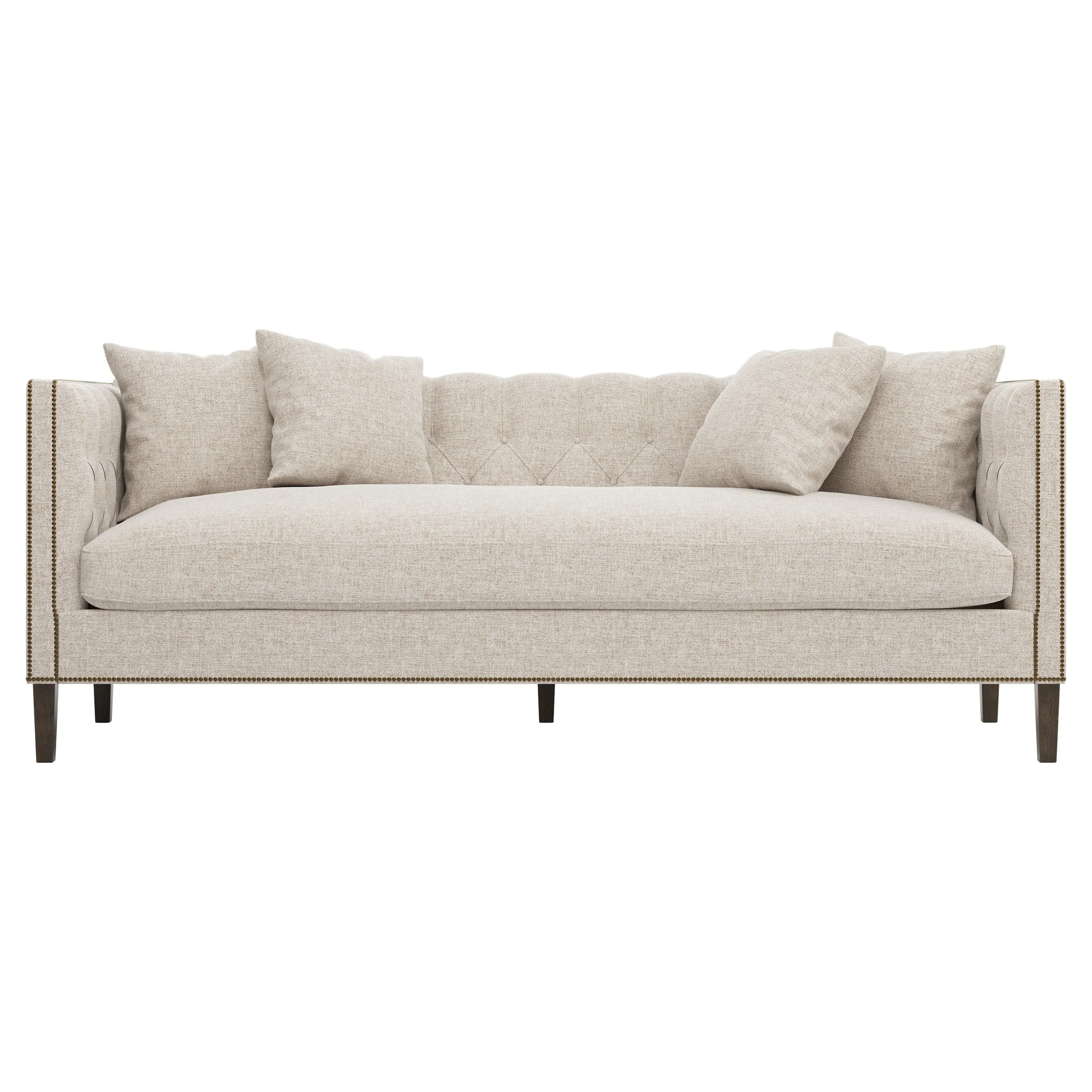 The Winifred sofa combines comfort with its bench cushion design, accented by brass nailhead trim. Its FSC-certified kiln-dried hardwood frame provides lasting durability, while the espresso finish adds rich contrast. The spacious seating suits relaxed gatherings, and the solid construction ensures reliable support. W234 x D91 x H86 cm.