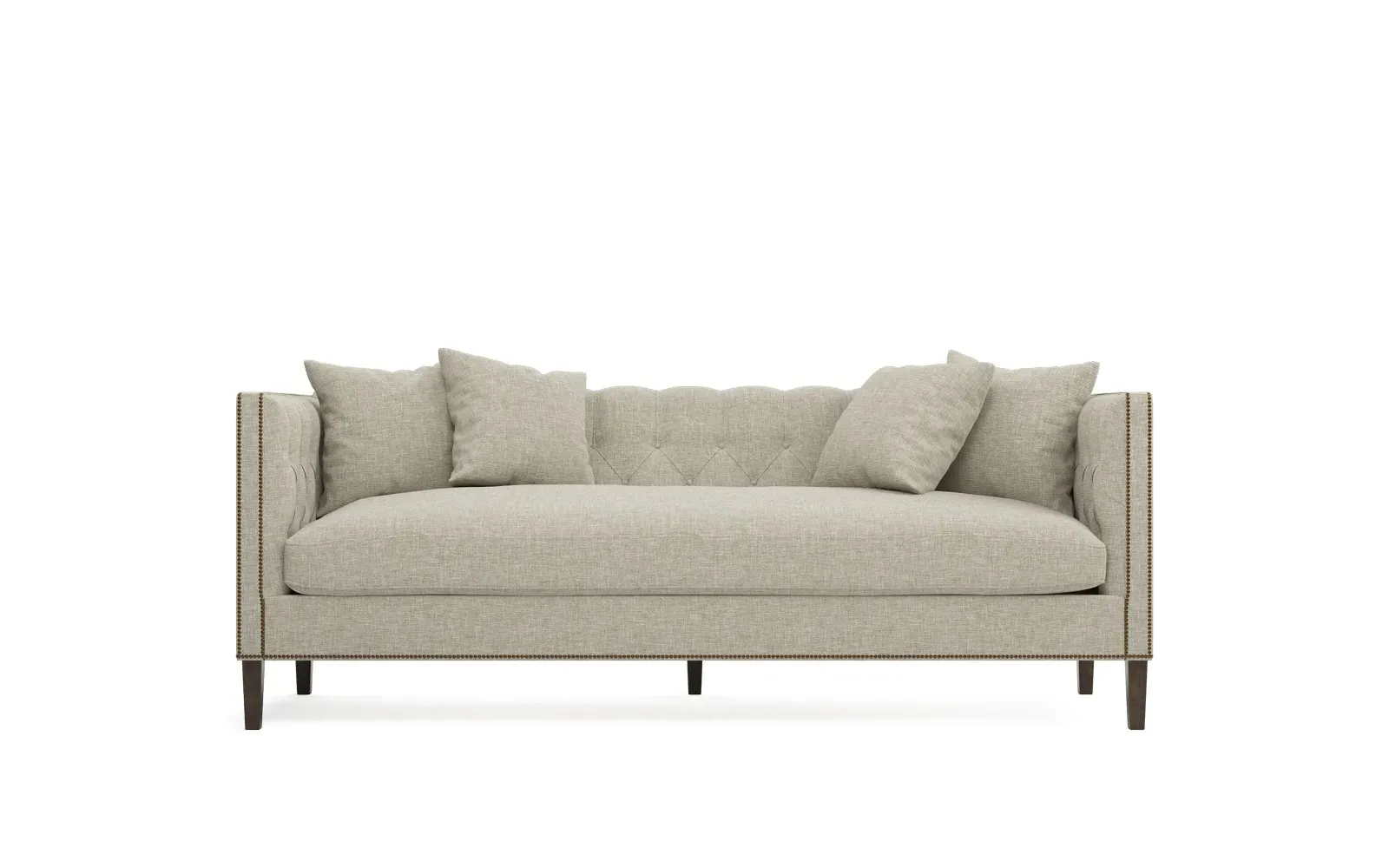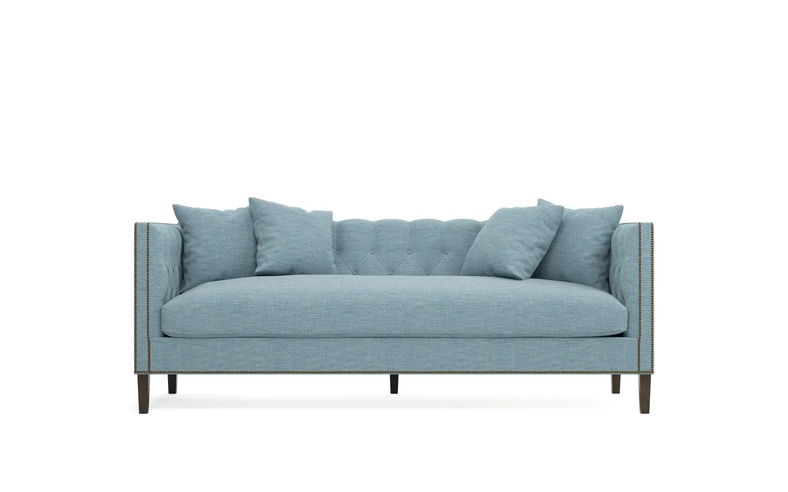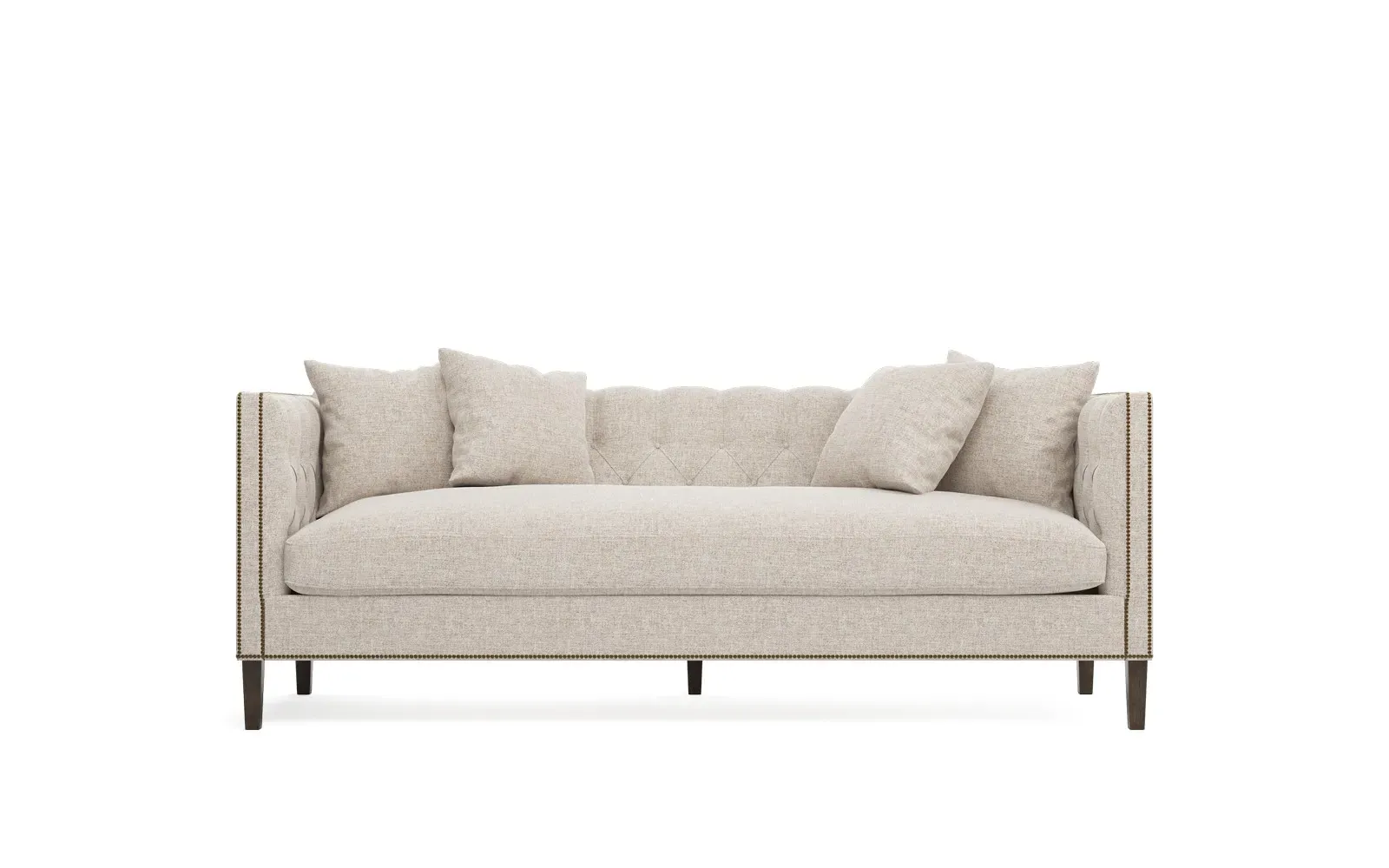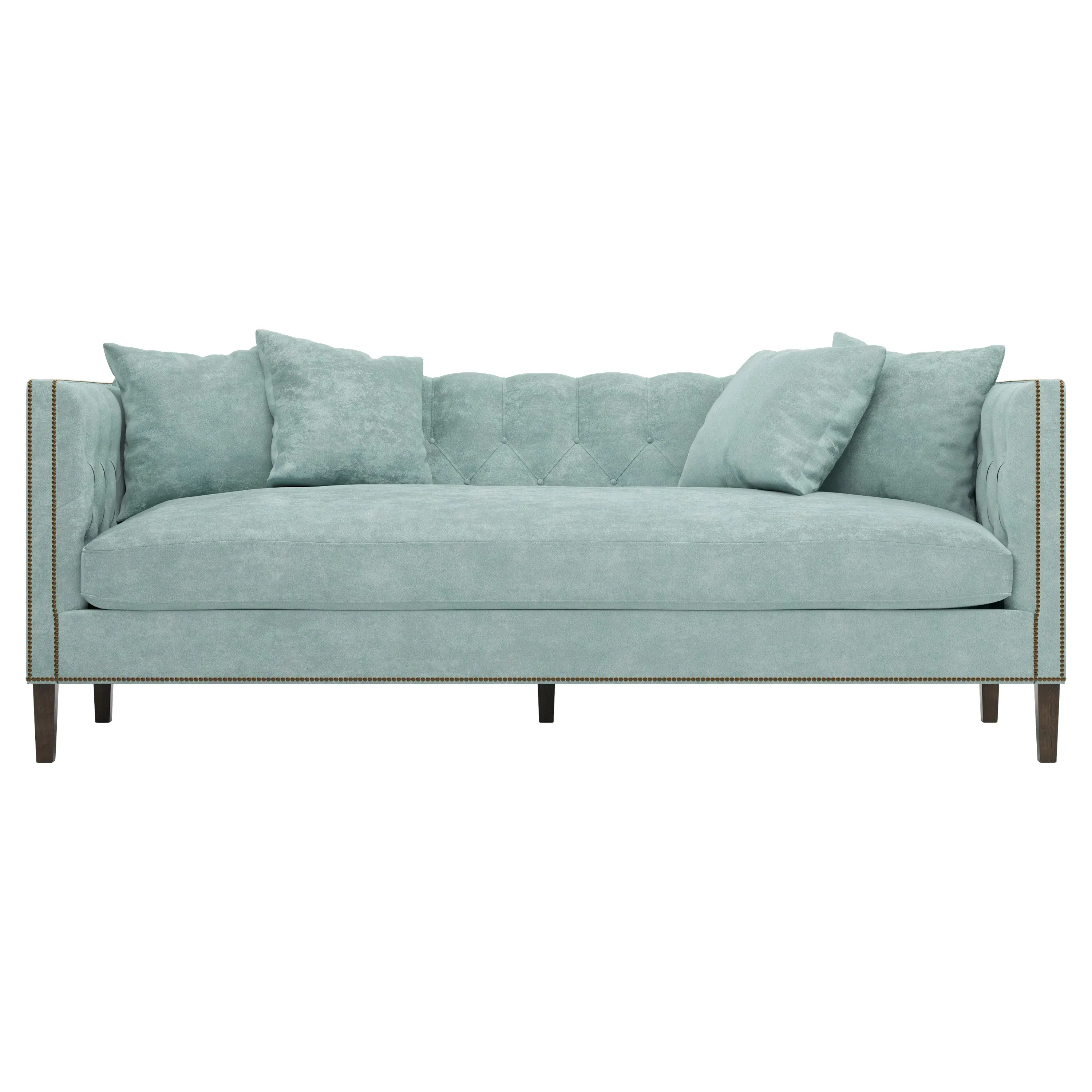 The Winifred sofa combines comfort with its bench cushion design, accented by brass nailhead trim. Its FSC-certified kiln-dried hardwood frame provides lasting durability, while the espresso finish adds rich contrast. The spacious seating suits relaxed gatherings, and the solid construction ensures reliable support. W234 x D91 x H86 cm.