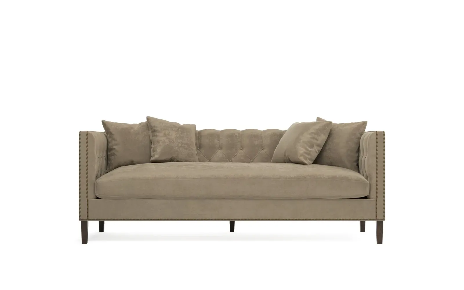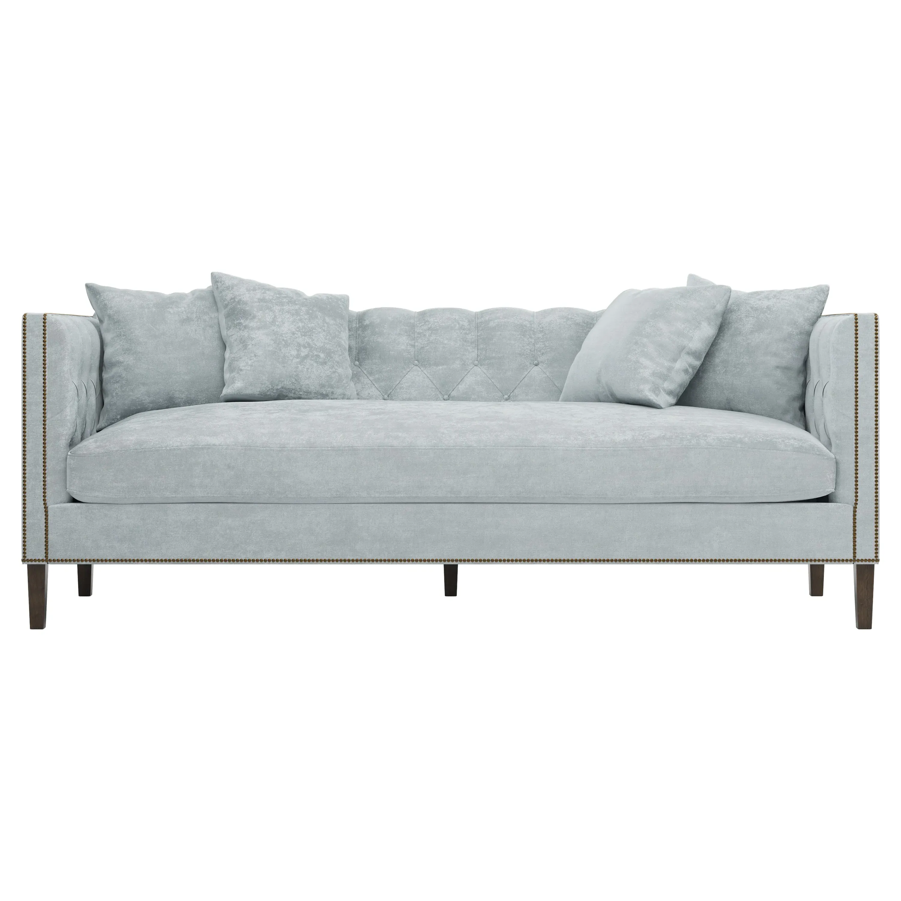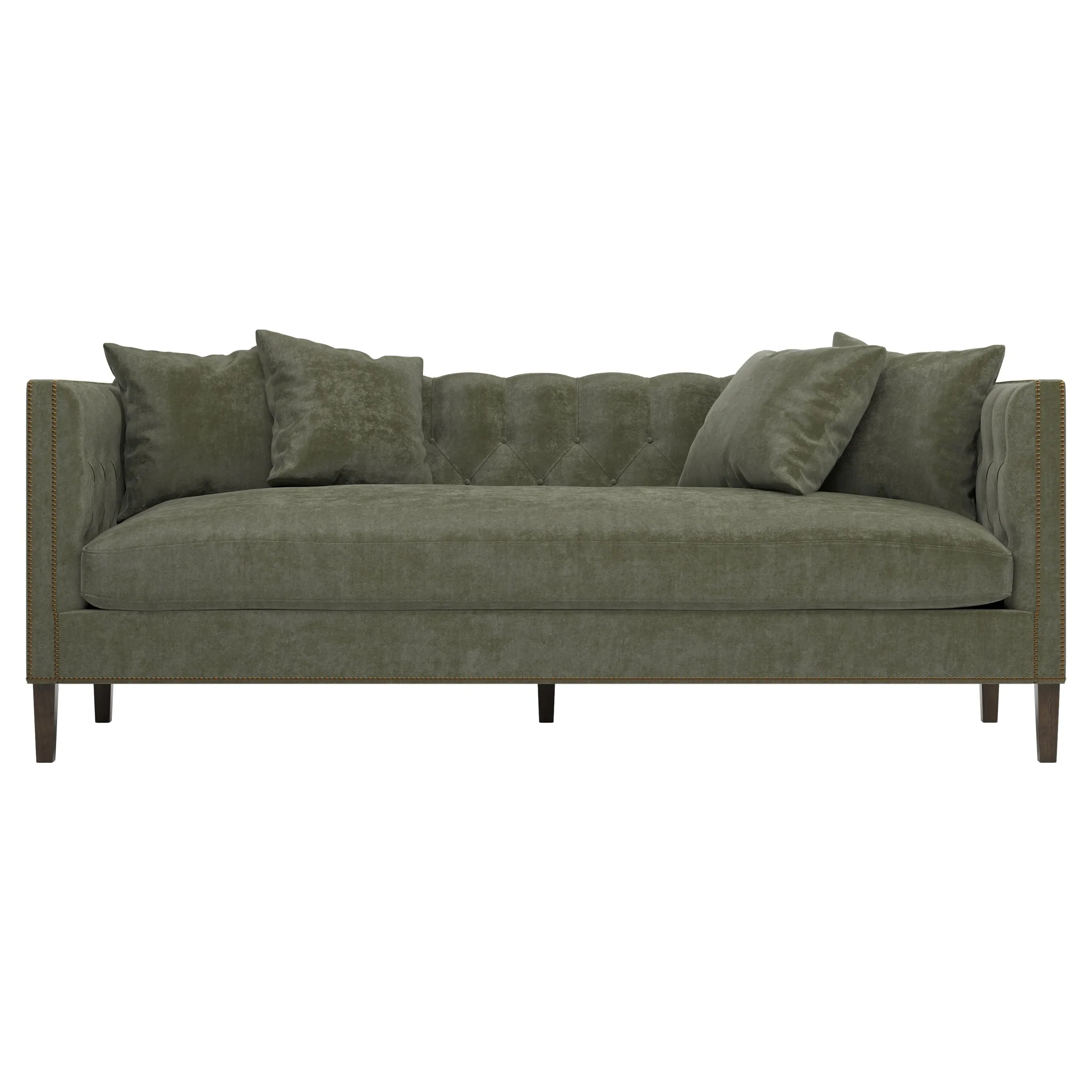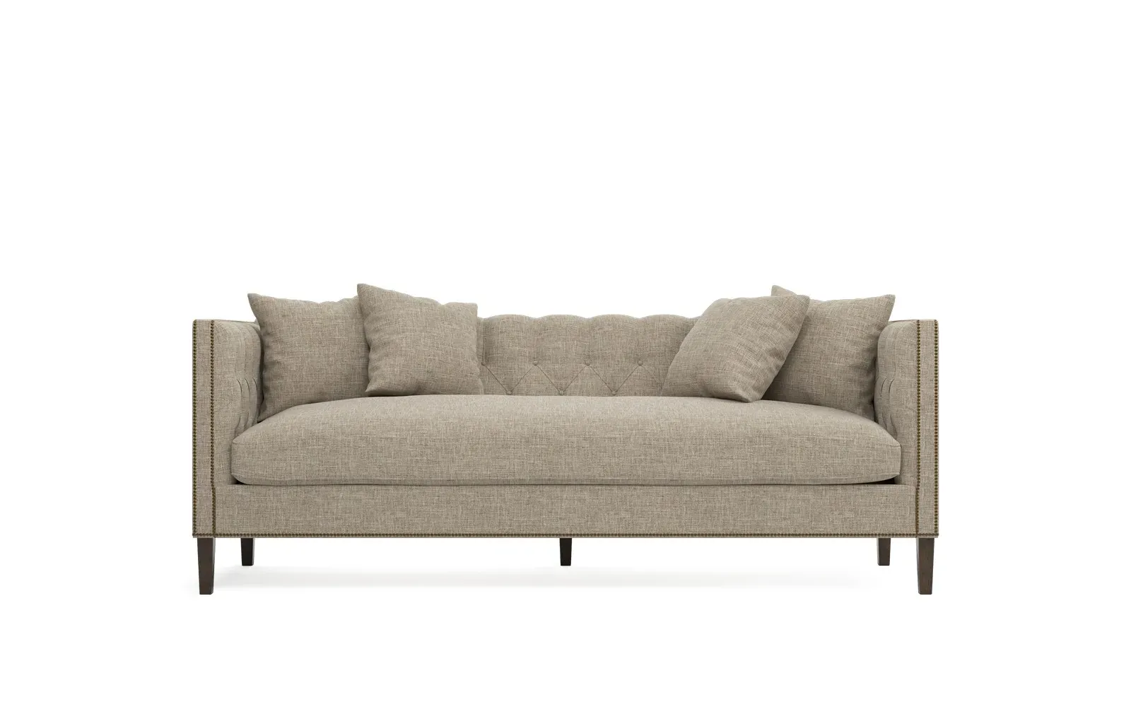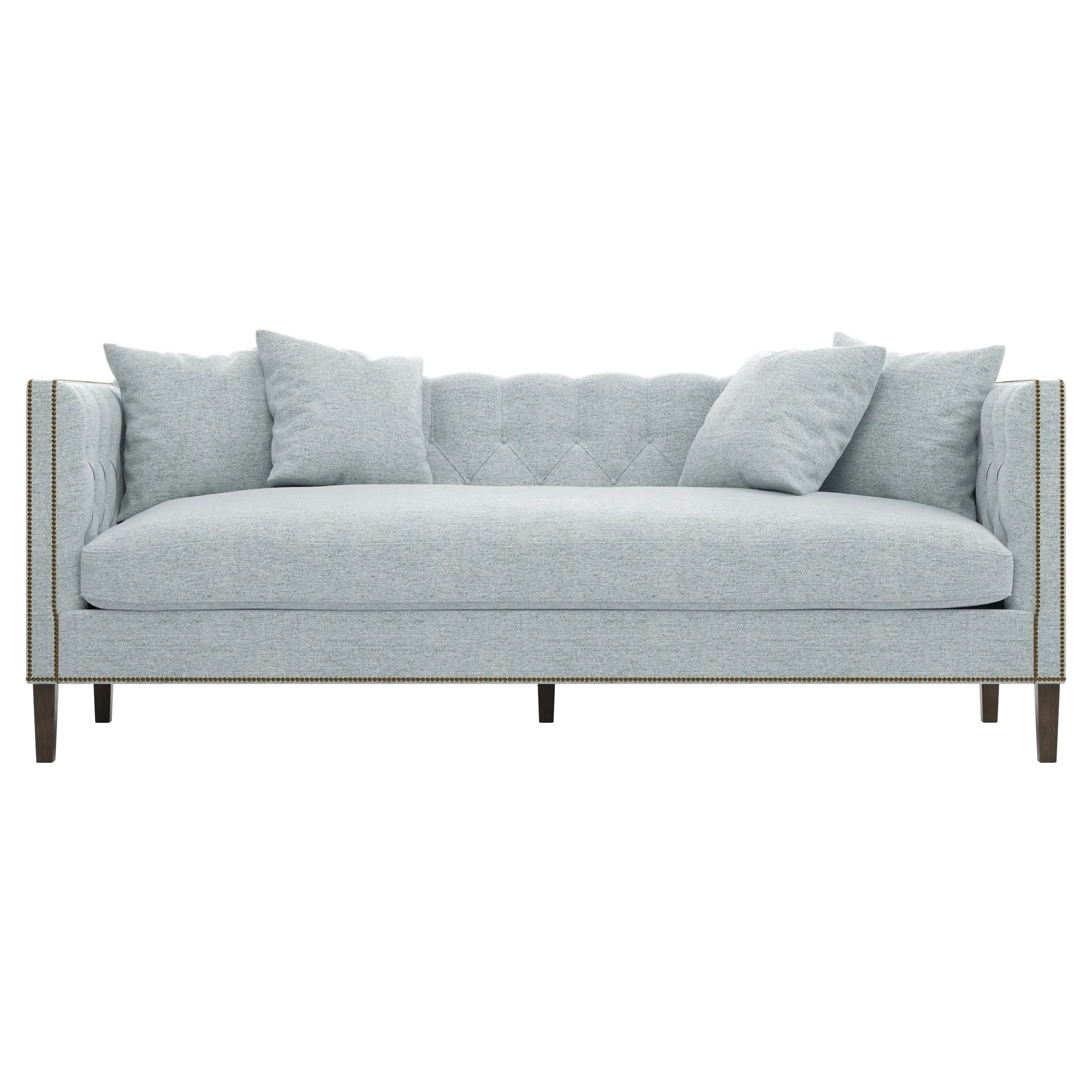 The Winifred sofa combines comfort with its bench cushion design, accented by brass nailhead trim. Its FSC-certified kiln-dried hardwood frame provides lasting durability, while the espresso finish adds rich contrast. The spacious seating suits relaxed gatherings, and the solid construction ensures reliable support. W234 x D91 x H86 cm.