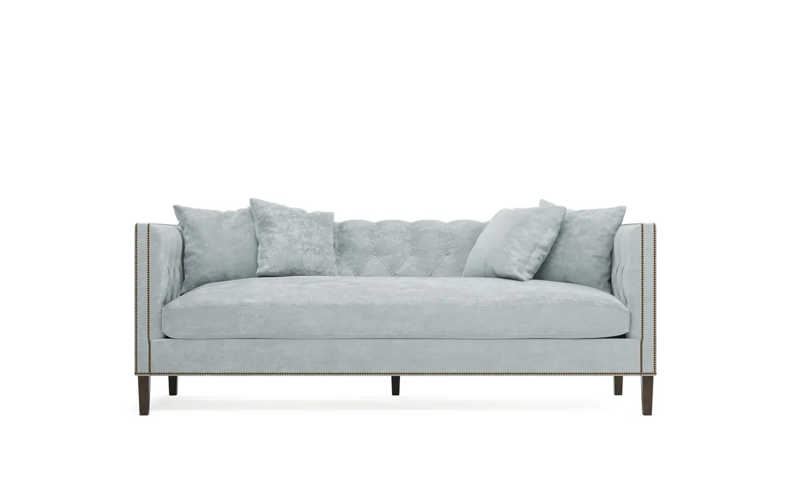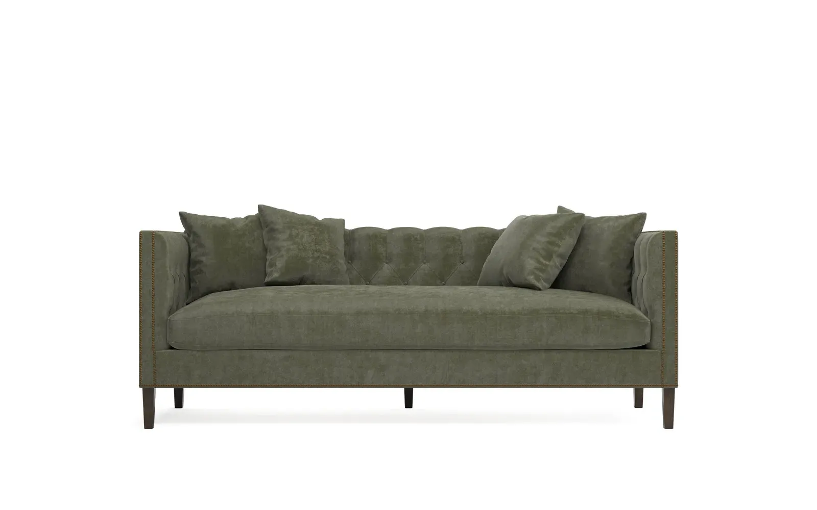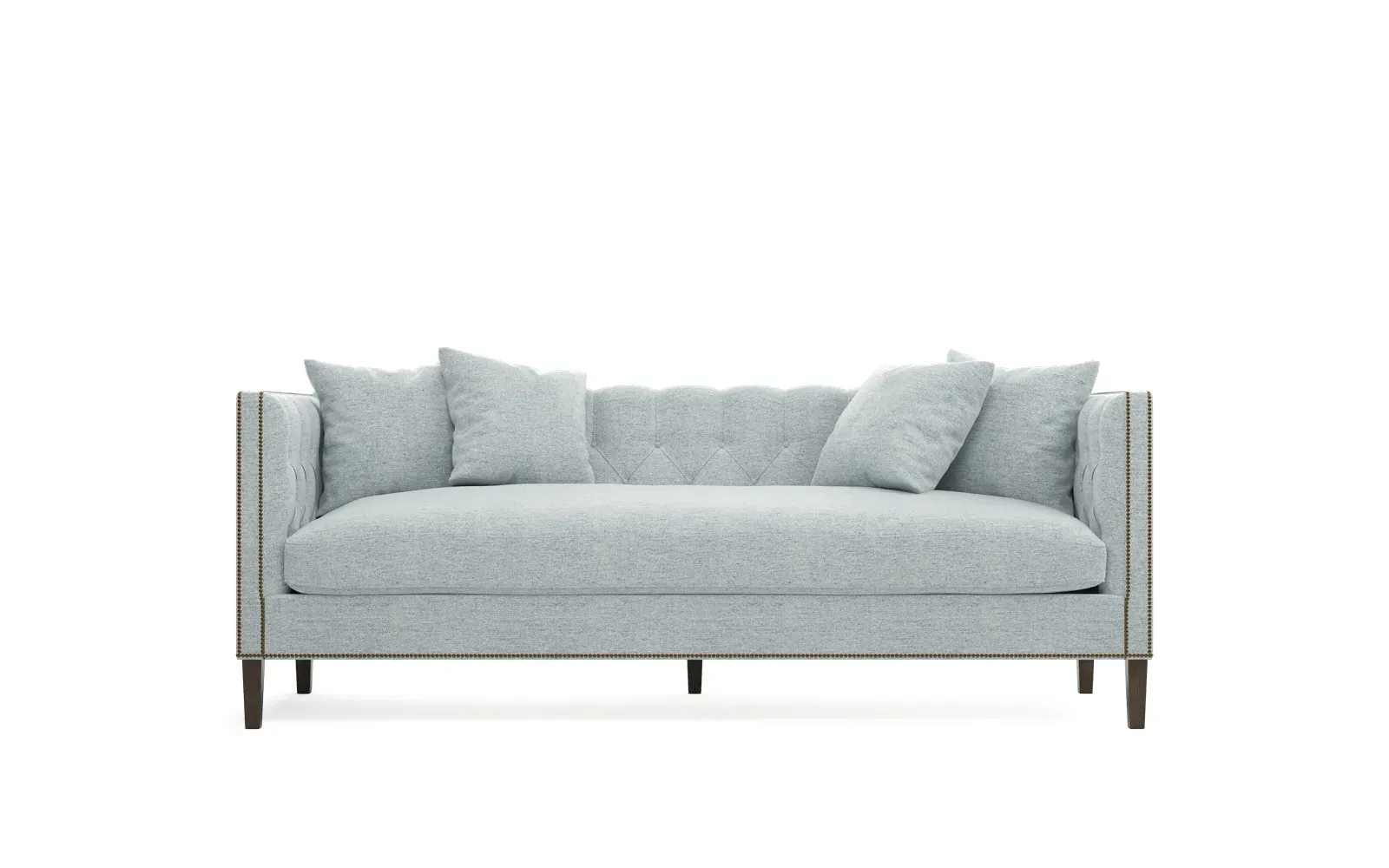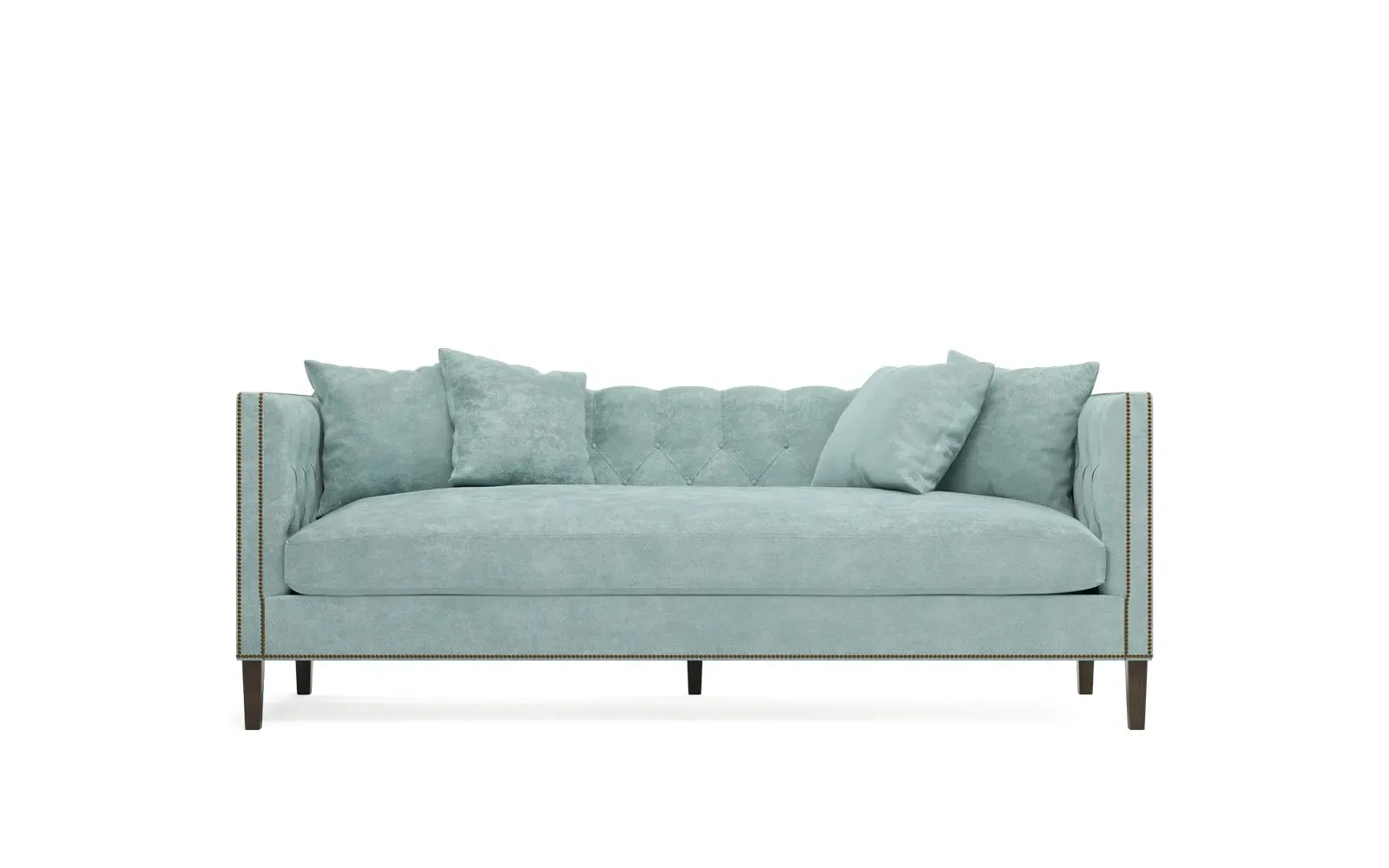 The Winifred sofa combines comfort with its bench cushion design, accented by brass nailhead trim. Its FSC-certified kiln-dried hardwood frame provides lasting durability, while the espresso finish adds rich contrast. The spacious seating suits relaxed gatherings, and the solid construction ensures reliable support. W234 x D91 x H86 cm.