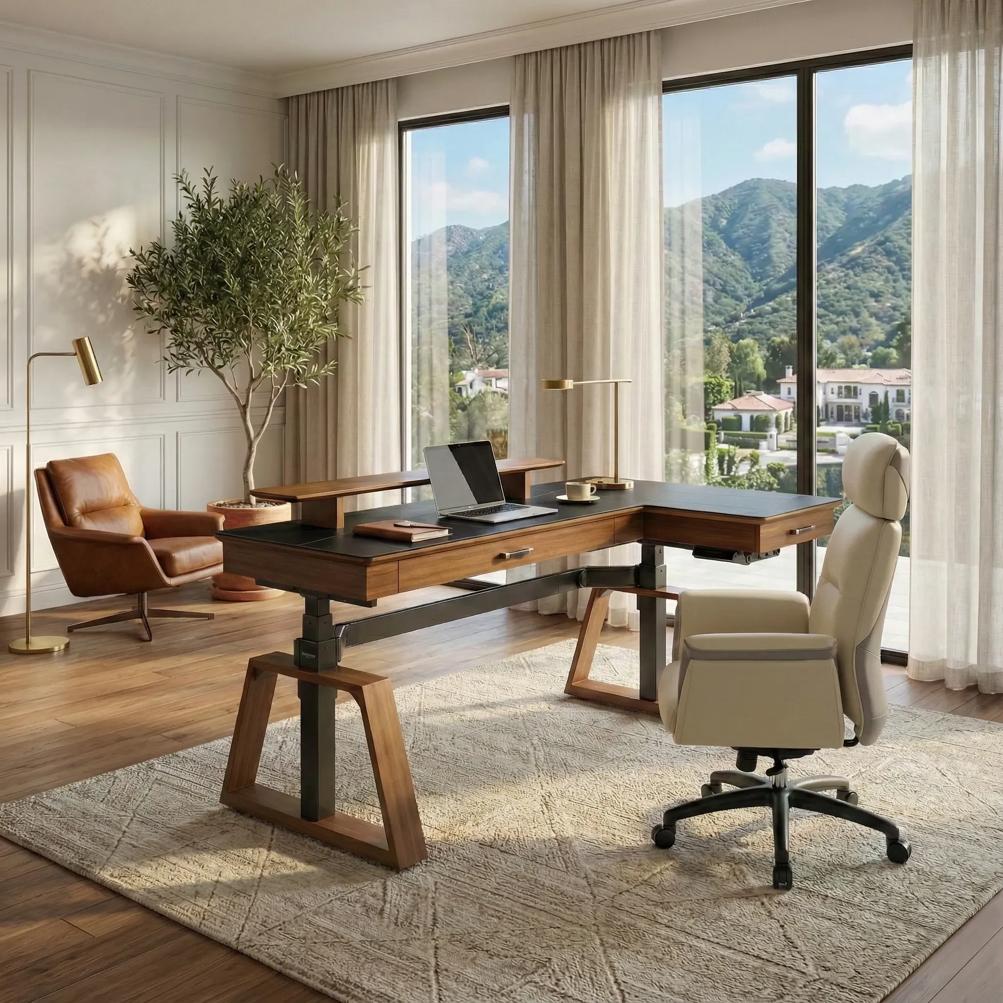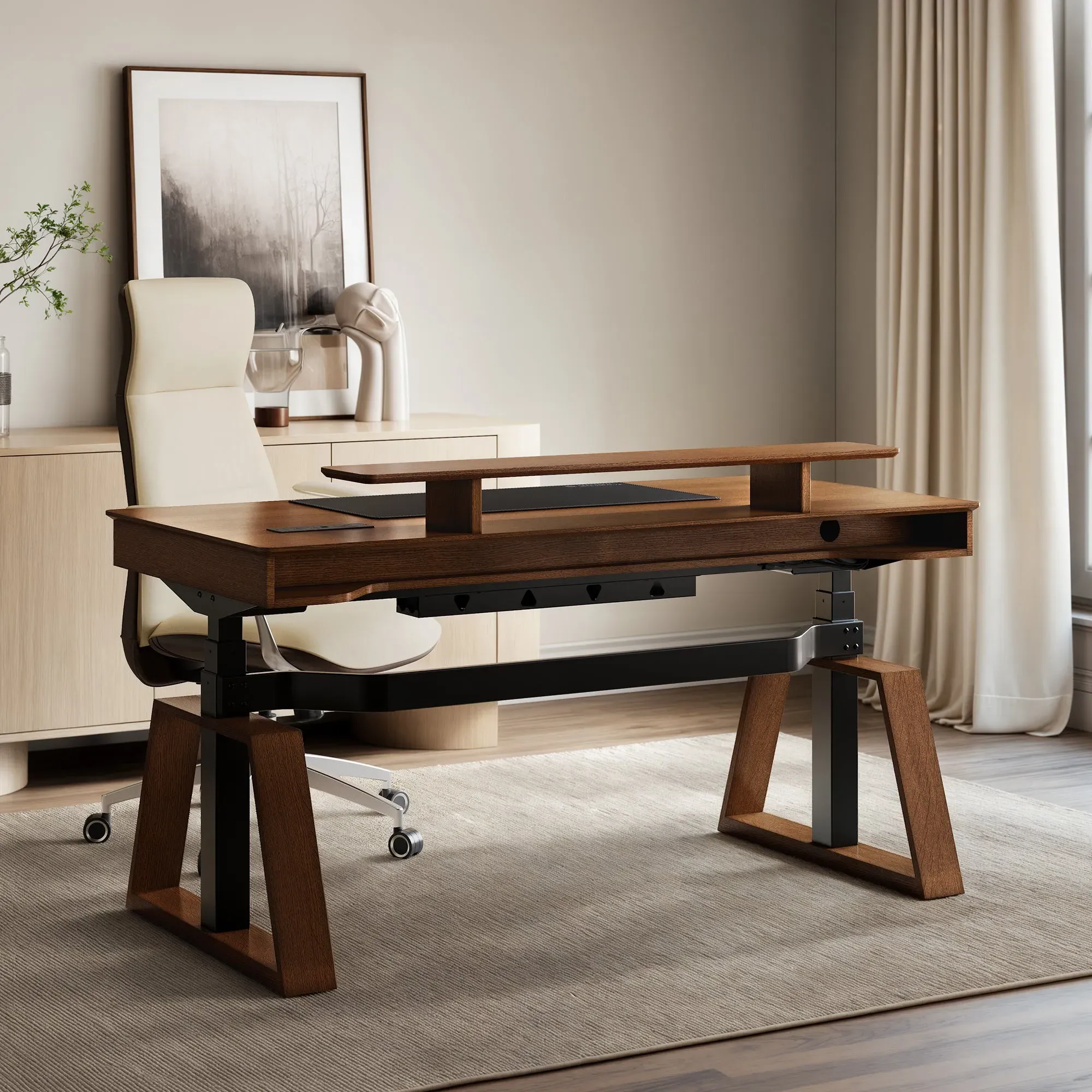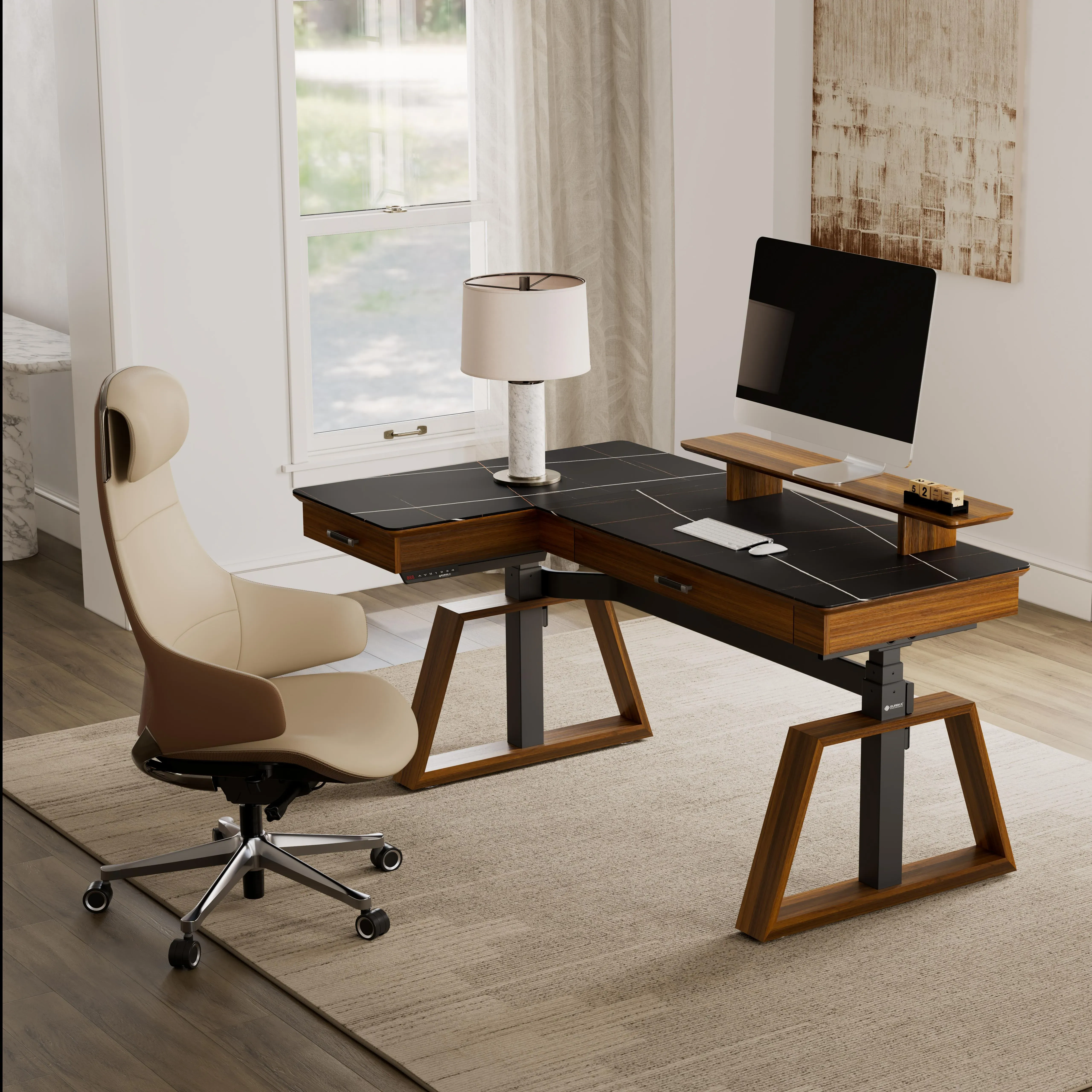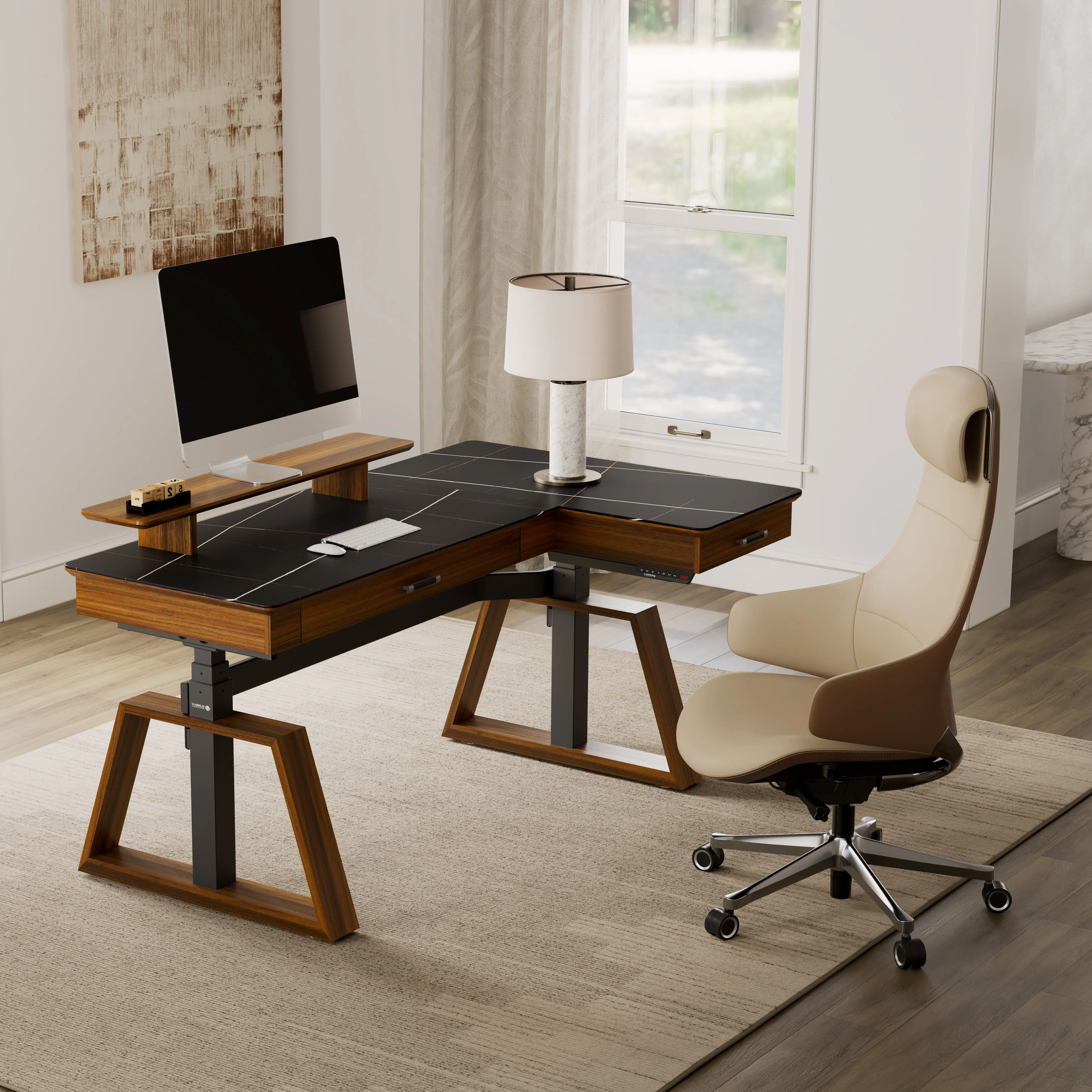 Enhance your daily workflow with a workspace setup designed for the modern professional with Ark X standing desk and synthetic leather chair. The Executive Office Set combines active working solutions with supportive seating. A seamless combination that enhances both productivity and elegance in your office space.