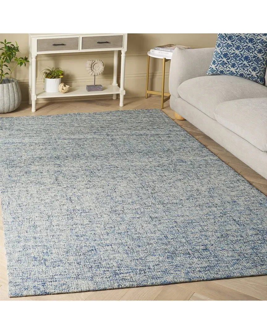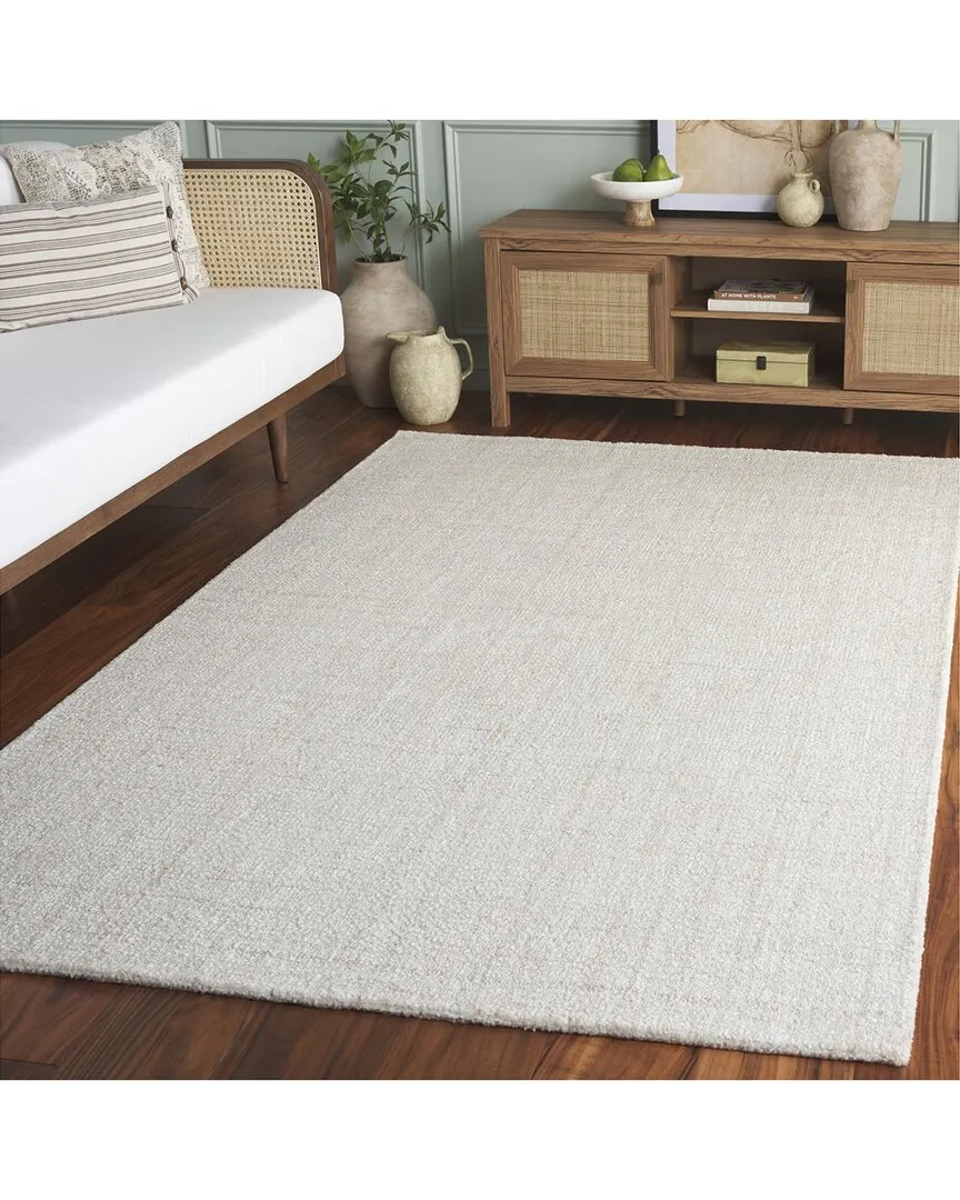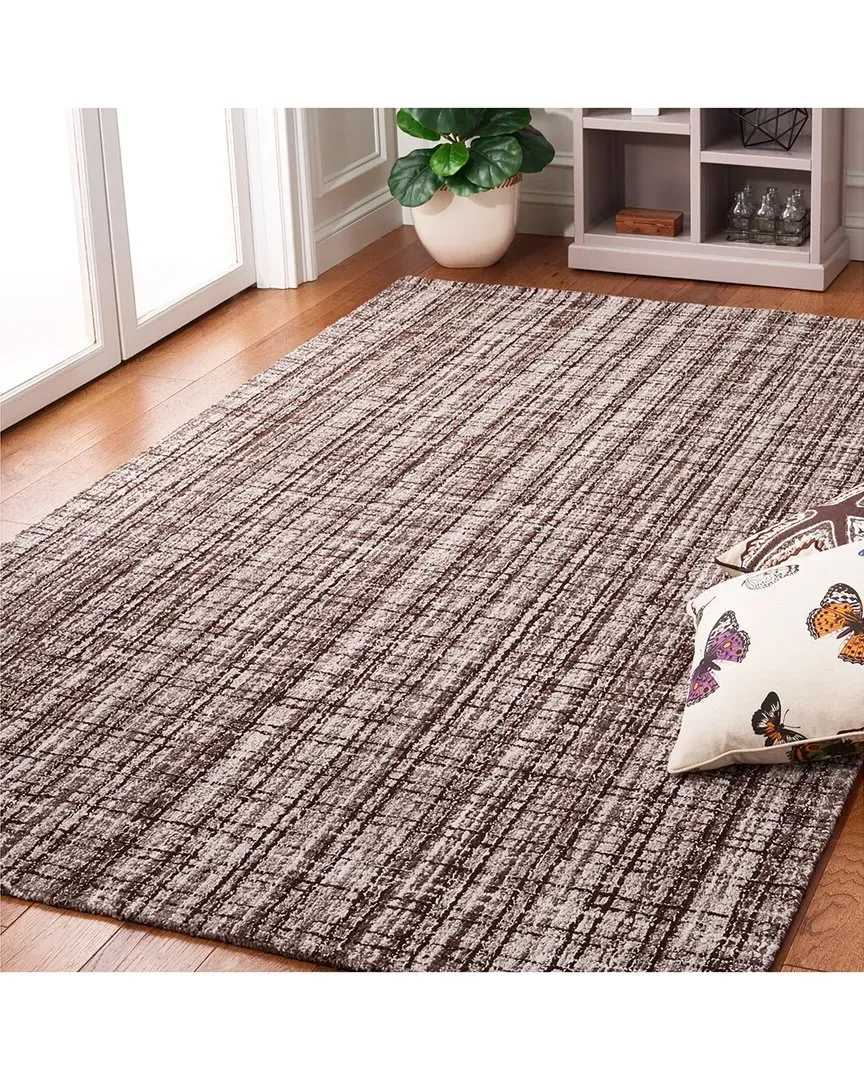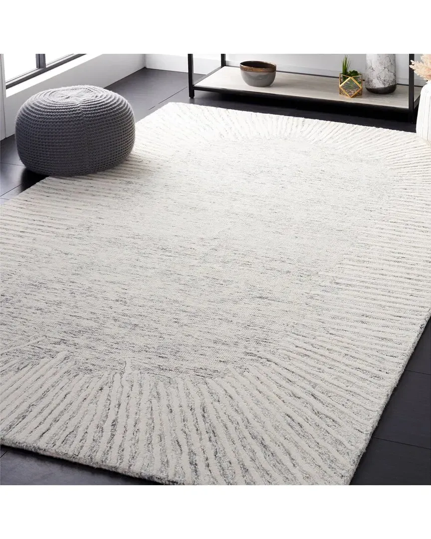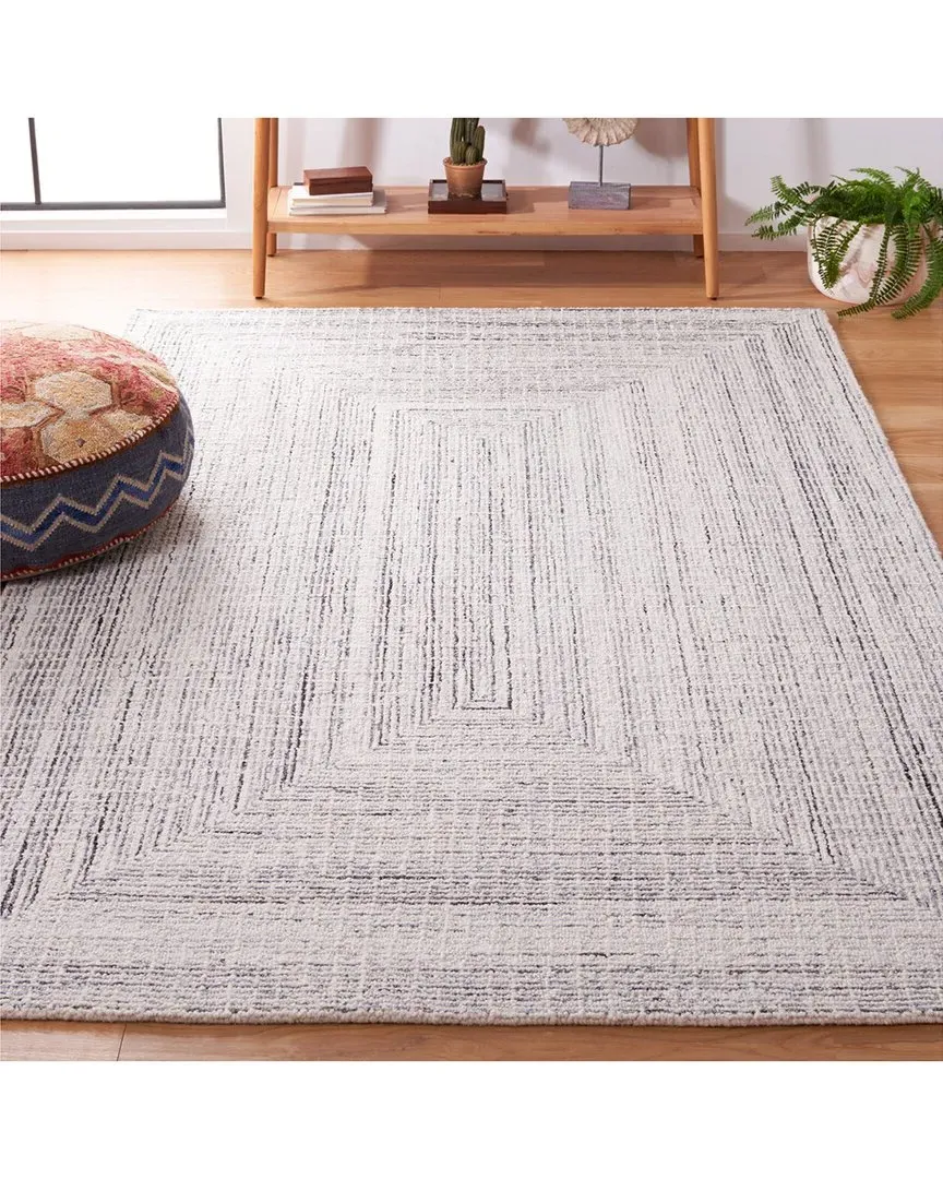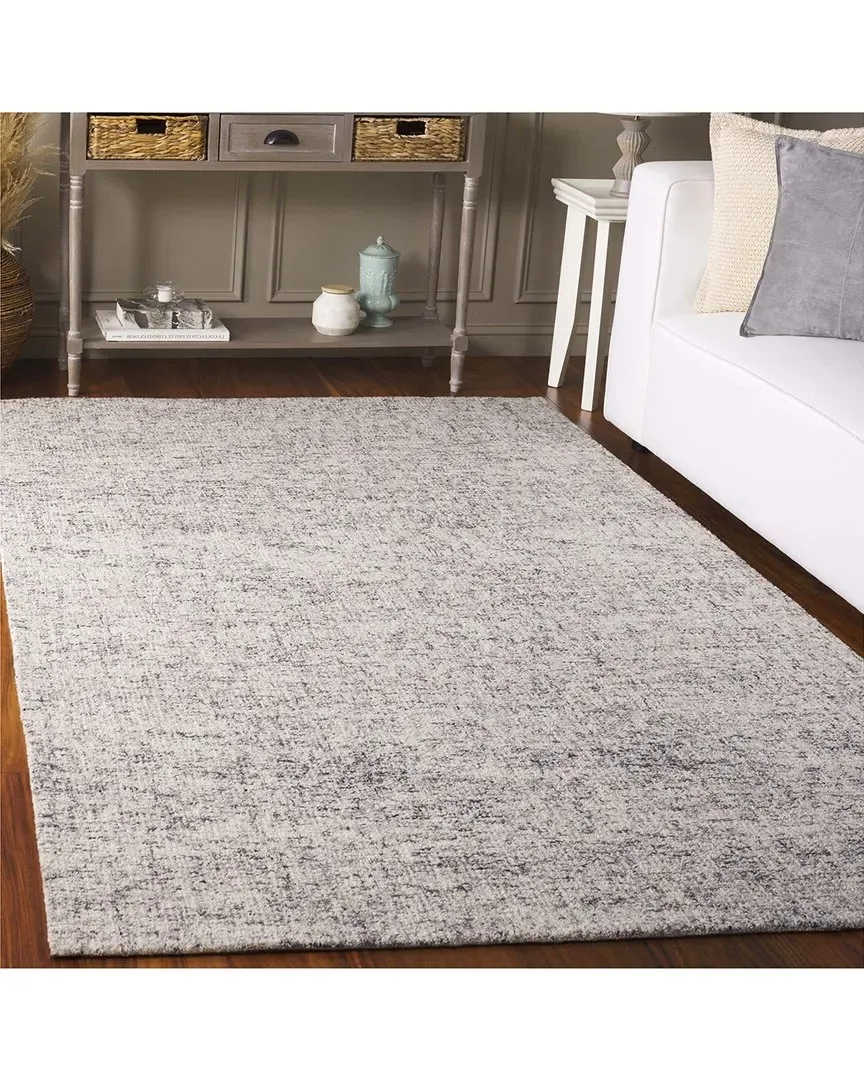 About the brand: Finely-crafted home furnishings with a unique flair. Color/pattern: ivory / dark grey Design details: The Abstract Rug Collection features texture-rich rugs with all-over designs and a cushion-soft loop pile. Abstract rugs are hand-tufted using pure wool and styled with engaging patterns in harmonious hues that convey a warm, welcoming aspect in room decor. 3/8'' pile; hand tufted; cotton with latex backing Suitable for indoor use 80% Wool, 20% Cotton Use rug protectors under the legs of heavy furniture to avoid flattening of your rug pile. Rotating your rug every few months will help relieve areas from excessive wear. Packing and shipping may cause temporary creases in area rugs. To remove them back-roll/reverse roll your rug and allow time for the creases to relax. Wool rugs, especially new wool rugs, may shed. To reduce excessive shedding, vacuum your rug 1-2 times per week in the direction of the pile. Shedding should diminish within several weeks. Vacuum thoroughly at least once a week with a canister vacuum. Do not engage beater bars. Rugs placed in high traffic areas of the home, office or rugs exposed to household pets should be vacuumed more frequently. Avoid vacuuming the fringes of your rug, especially those on hand-knotted rugs. Use a broom to clean fringes. Brushing is the best way to remove stubborn pet hairs that the vacuum misses. For short pile area rugs, use a carpet brush or carpet sweeper. For longer pile a carpet rake works well. For rugs that are relatively easy to handle, bring them outdoors and shake vigorously to remove excess debris. For lighter stains or spills on synthetic yarns, sponge clean the area with cold water and mild detergent. For harder to remove stains, professional rug cleaning is recommended. Imported Please note: Measurements were taken by hand and are approximate; Please allow for slight variations.