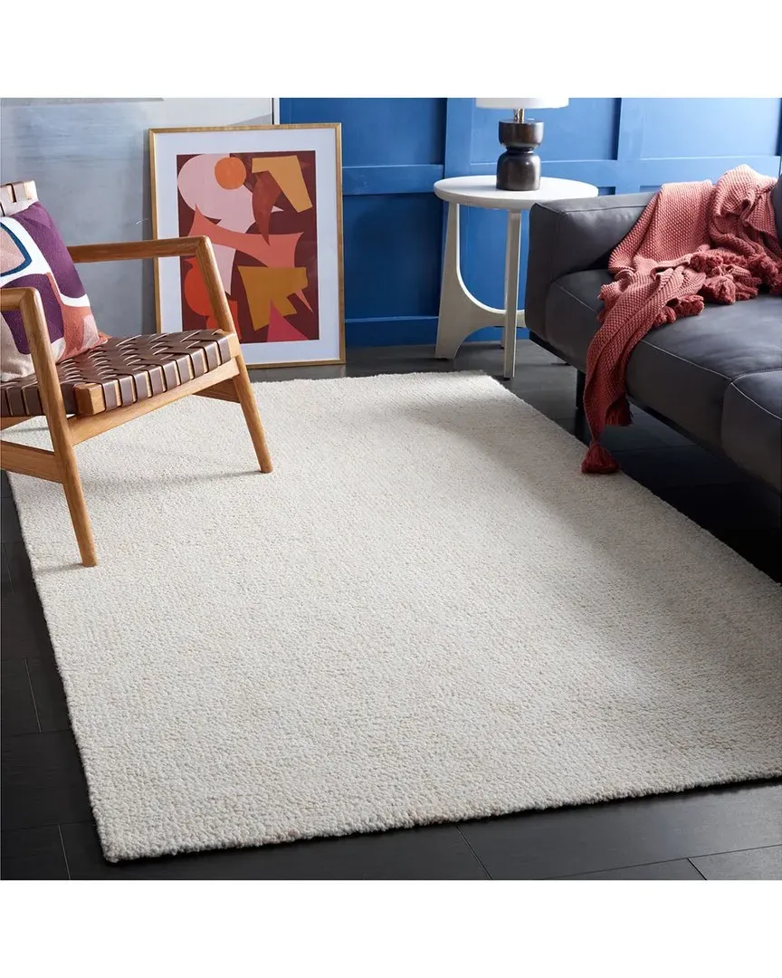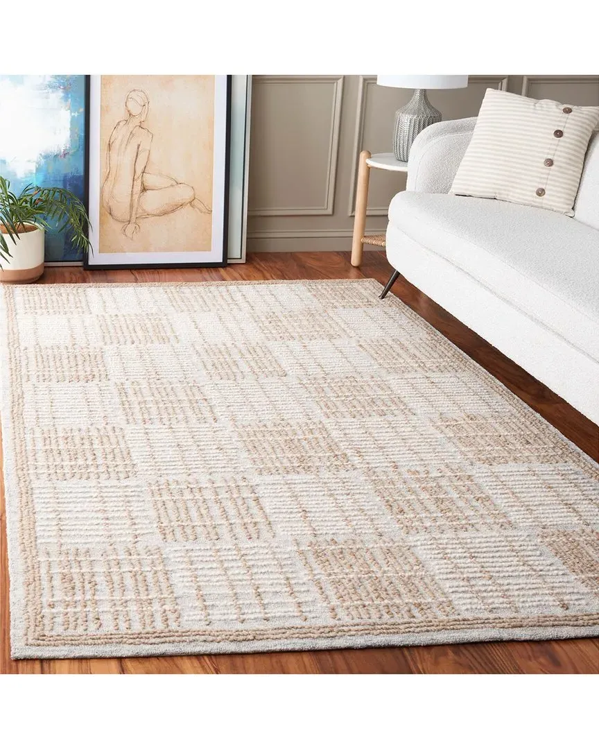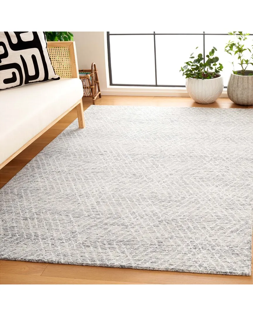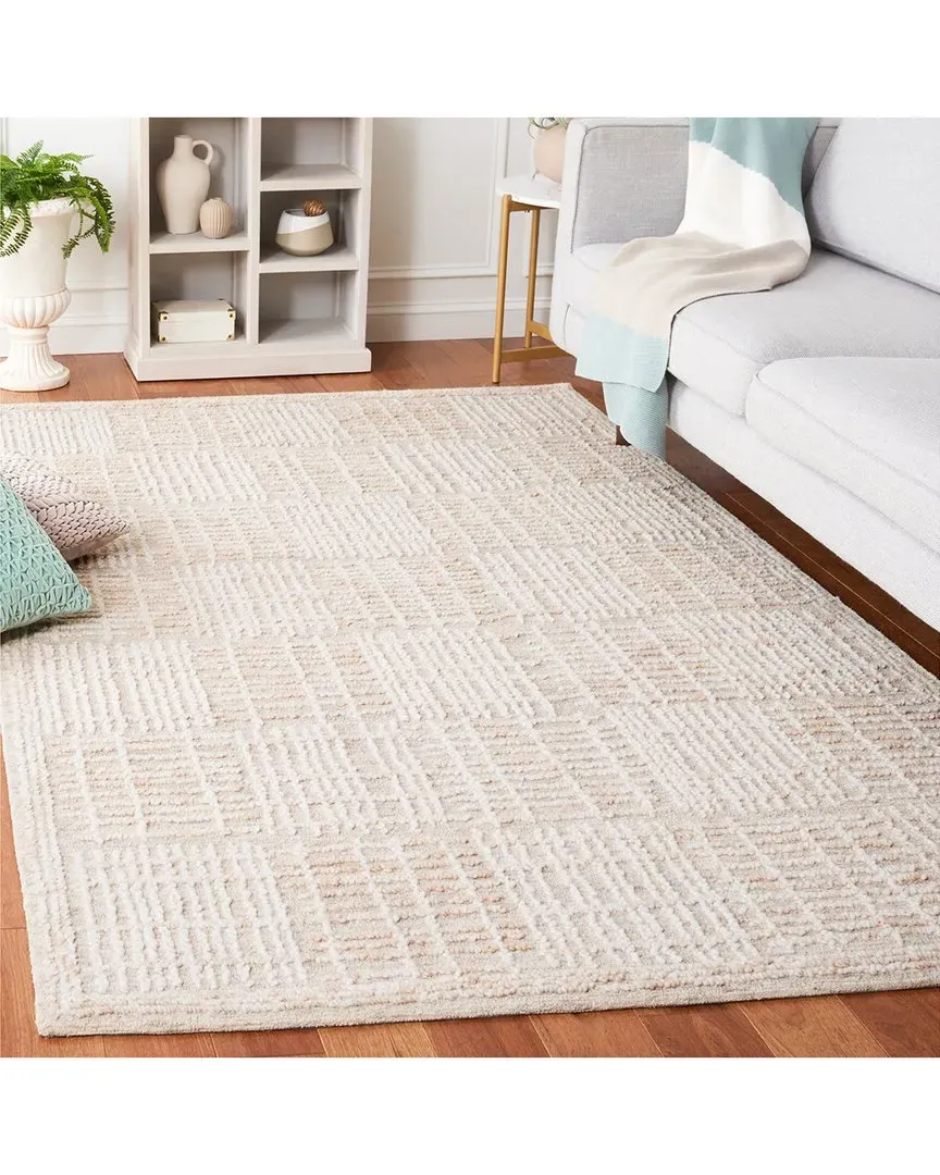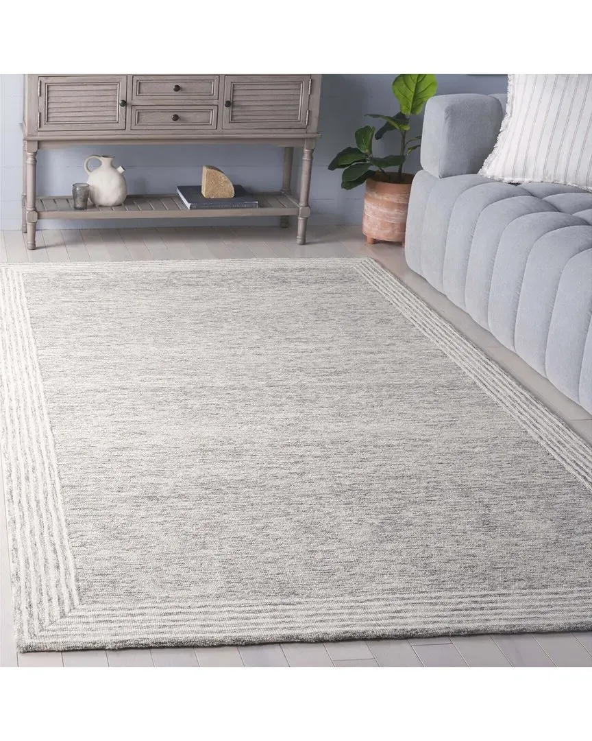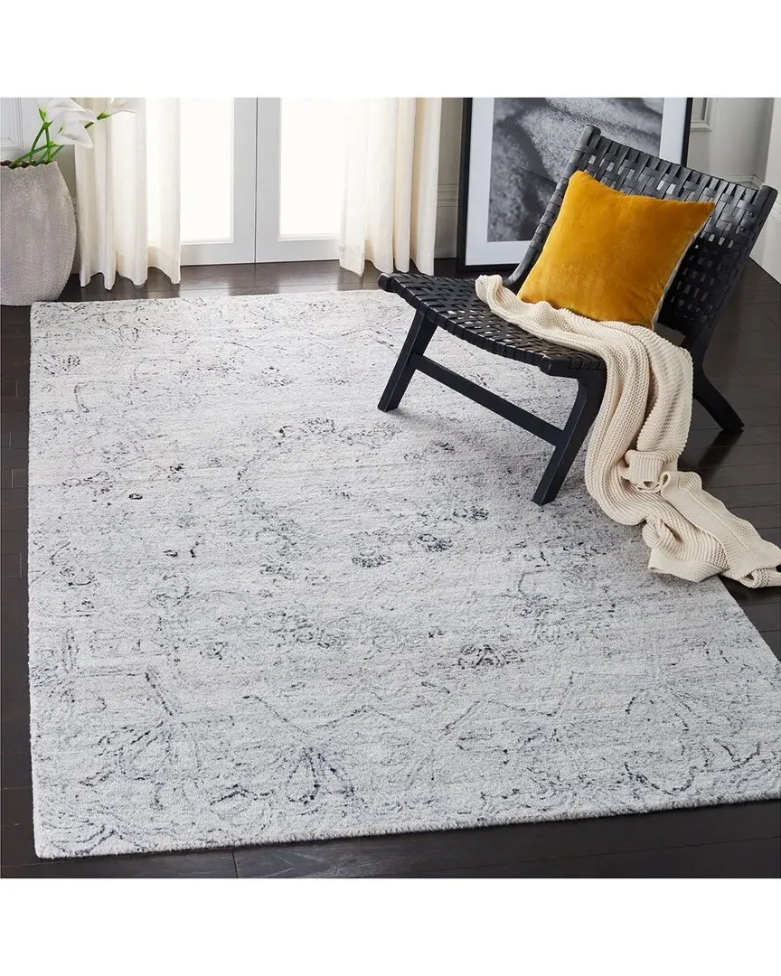 About the brand: Finely-crafted home furnishings with a unique flair. Color/pattern: ivory / dark grey Design details: The Abstract Rug Collection features texture-rich rugs with all-over designs and a cushion-soft loop pile. Abstract rugs are hand-tufted using pure wool and styled with engaging patterns in harmonious hues that convey a warm, welcoming aspect in room decor. 3/8'' pile; hand tufted; cotton with latex backing Suitable for indoor use 80% Wool, 20% Cotton Use rug protectors under the legs of heavy furniture to avoid flattening of your rug pile. Rotating your rug every few months will help relieve areas from excessive wear. Packing and shipping may cause temporary creases in area rugs. To remove them back-roll/reverse roll your rug and allow time for the creases to relax. Wool rugs, especially new wool rugs, may shed. To reduce excessive shedding, vacuum your rug 1-2 times per week in the direction of the pile. Shedding should diminish within several weeks. Vacuum thoroughly at least once a week with a canister vacuum. Do not engage beater bars. Rugs placed in high traffic areas of the home, office or rugs exposed to household pets should be vacuumed more frequently. Avoid vacuuming the fringes of your rug, especially those on hand-knotted rugs. Use a broom to clean fringes. Brushing is the best way to remove stubborn pet hairs that the vacuum misses. For short pile area rugs, use a carpet brush or carpet sweeper. For longer pile a carpet rake works well. For rugs that are relatively easy to handle, bring them outdoors and shake vigorously to remove excess debris. For lighter stains or spills on synthetic yarns, sponge clean the area with cold water and mild detergent. For harder to remove stains, professional rug cleaning is recommended. Imported Please note: Measurements were taken by hand and are approximate; Please allow for slight variations.