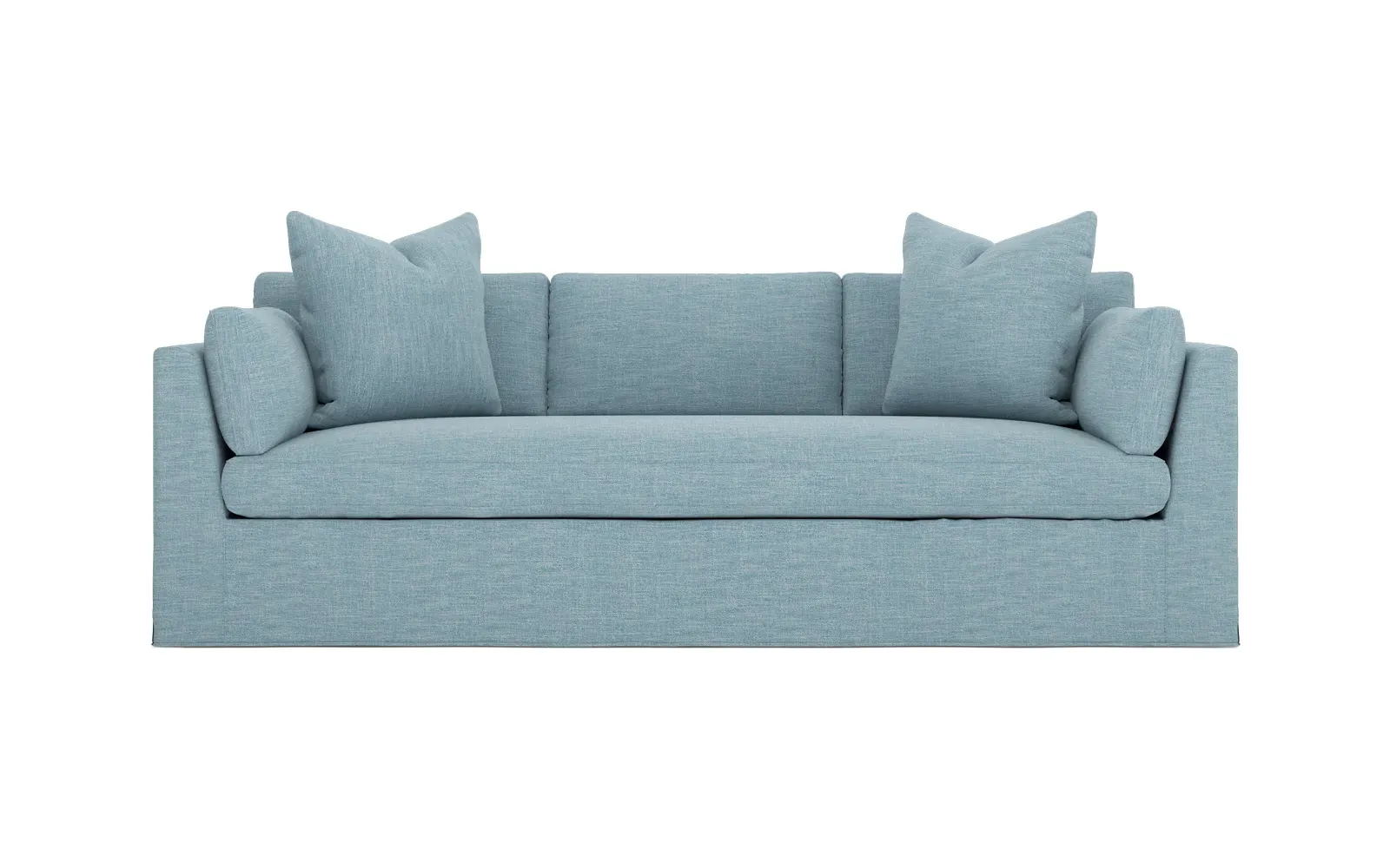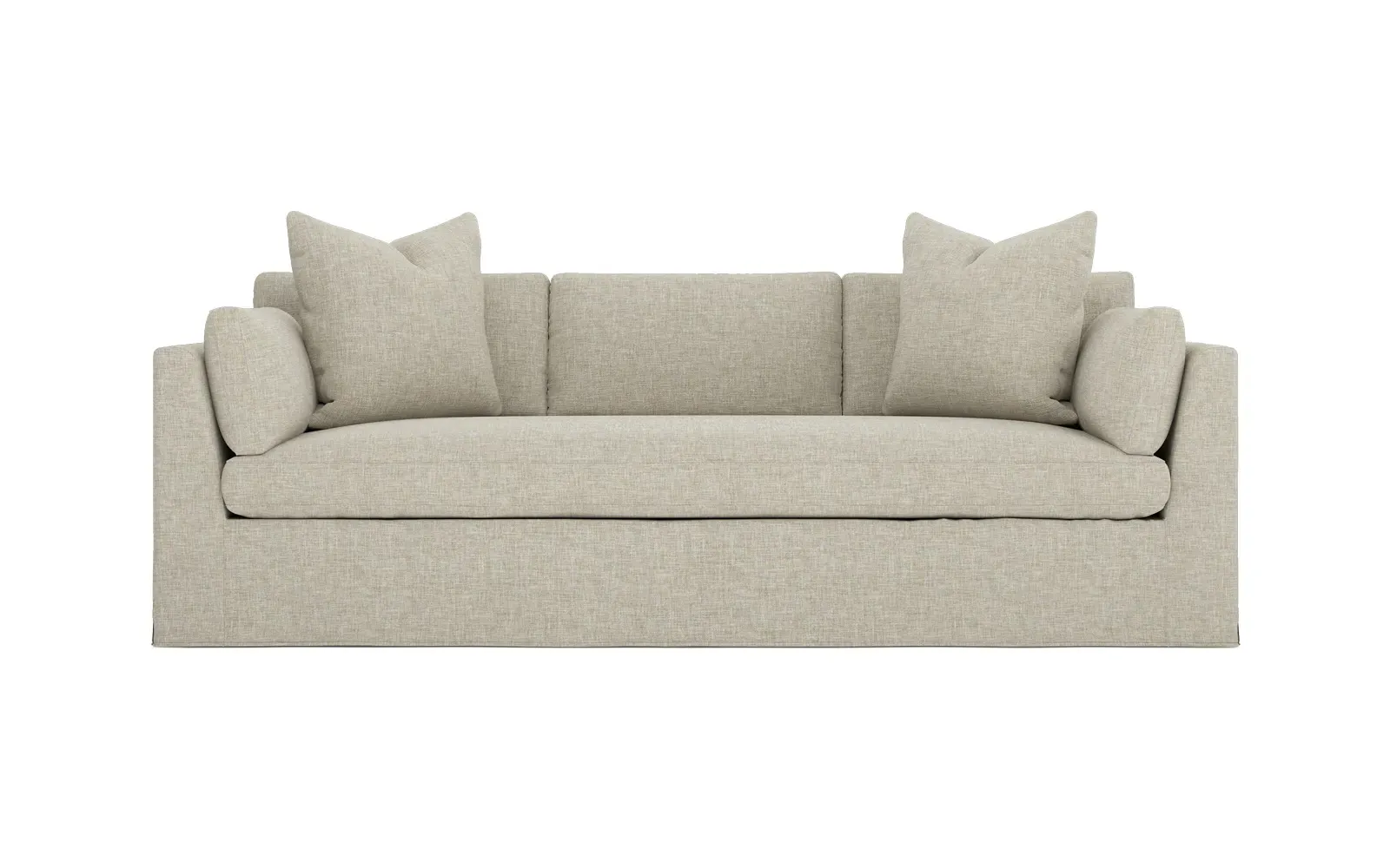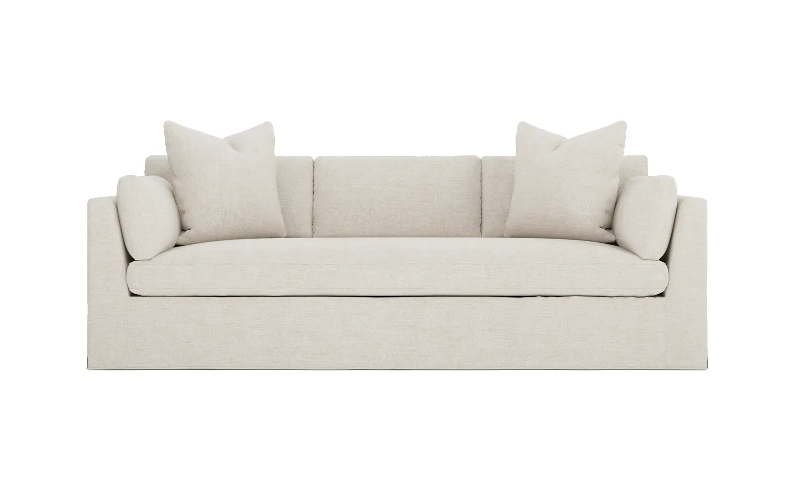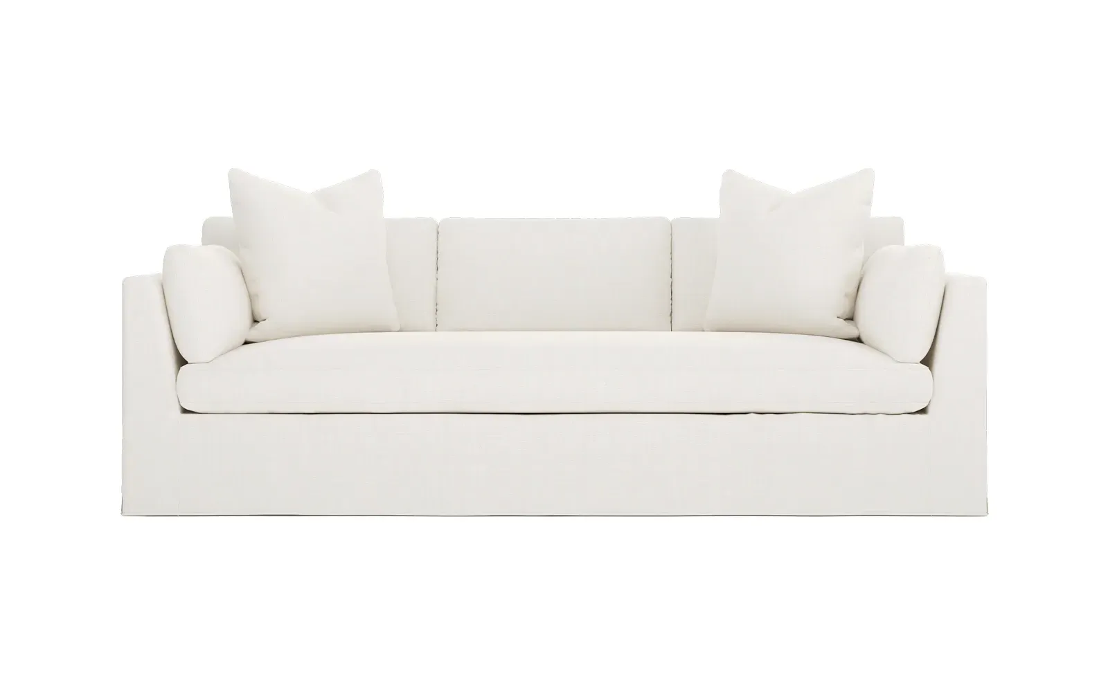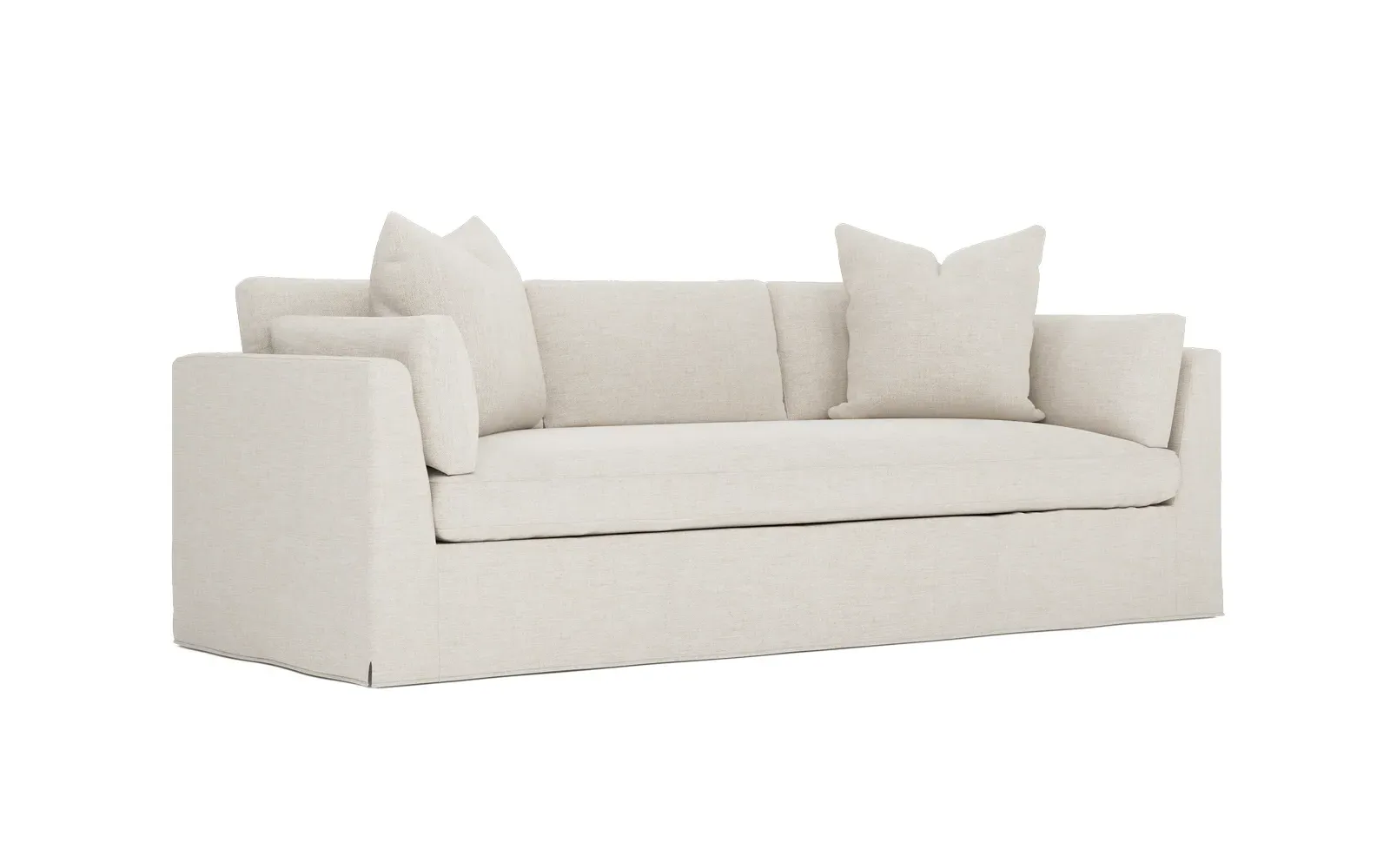 The Adelle slipcovered sofa combines comfort with its foam core surrounded by fiber, down, and feather fill. Its bench seat features two sets of pillows and gently angled arms for easy lounging, while the washable slipcover fabric adds practical appeal. The FSC-certified kiln-dried hardwood frame ensures durability, and the channel-quilted casing keeps materials evenly distributed. W251 x D97 x H89 cm.