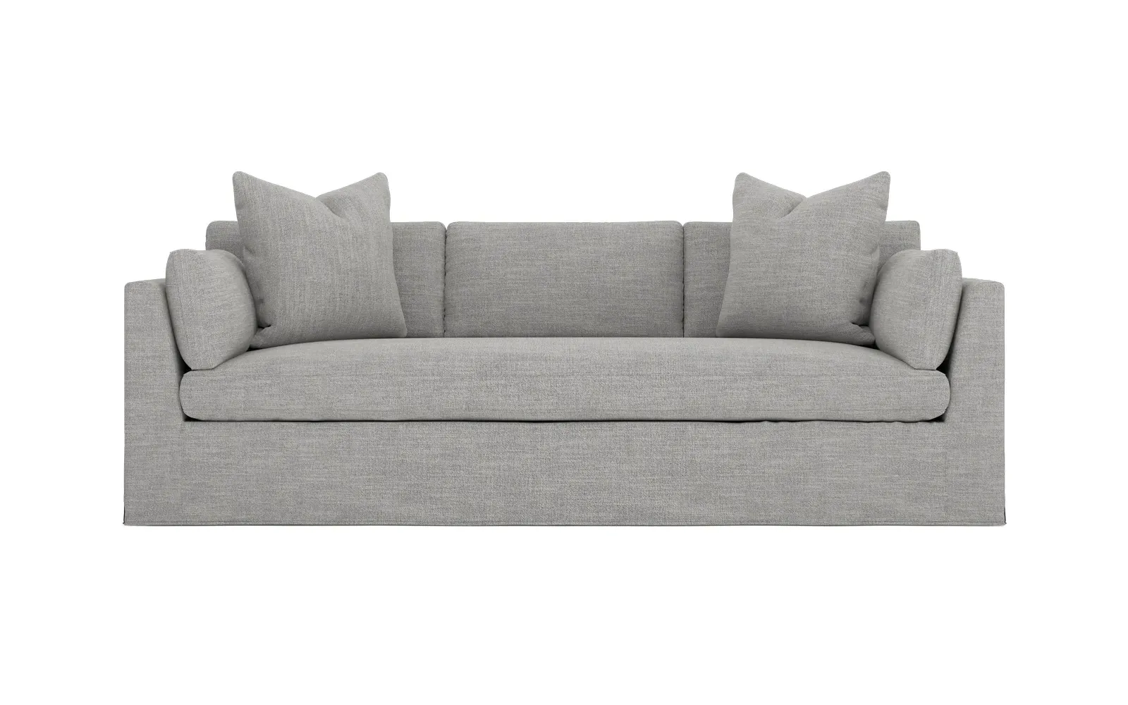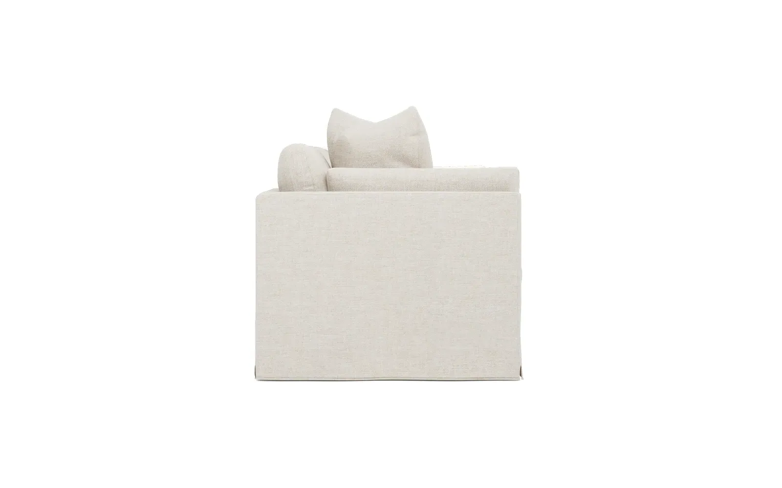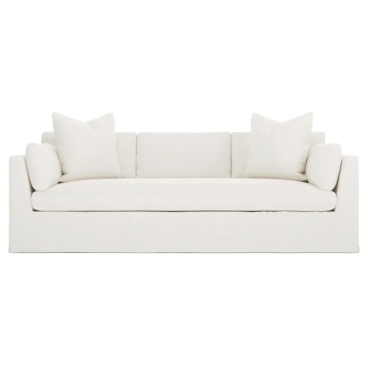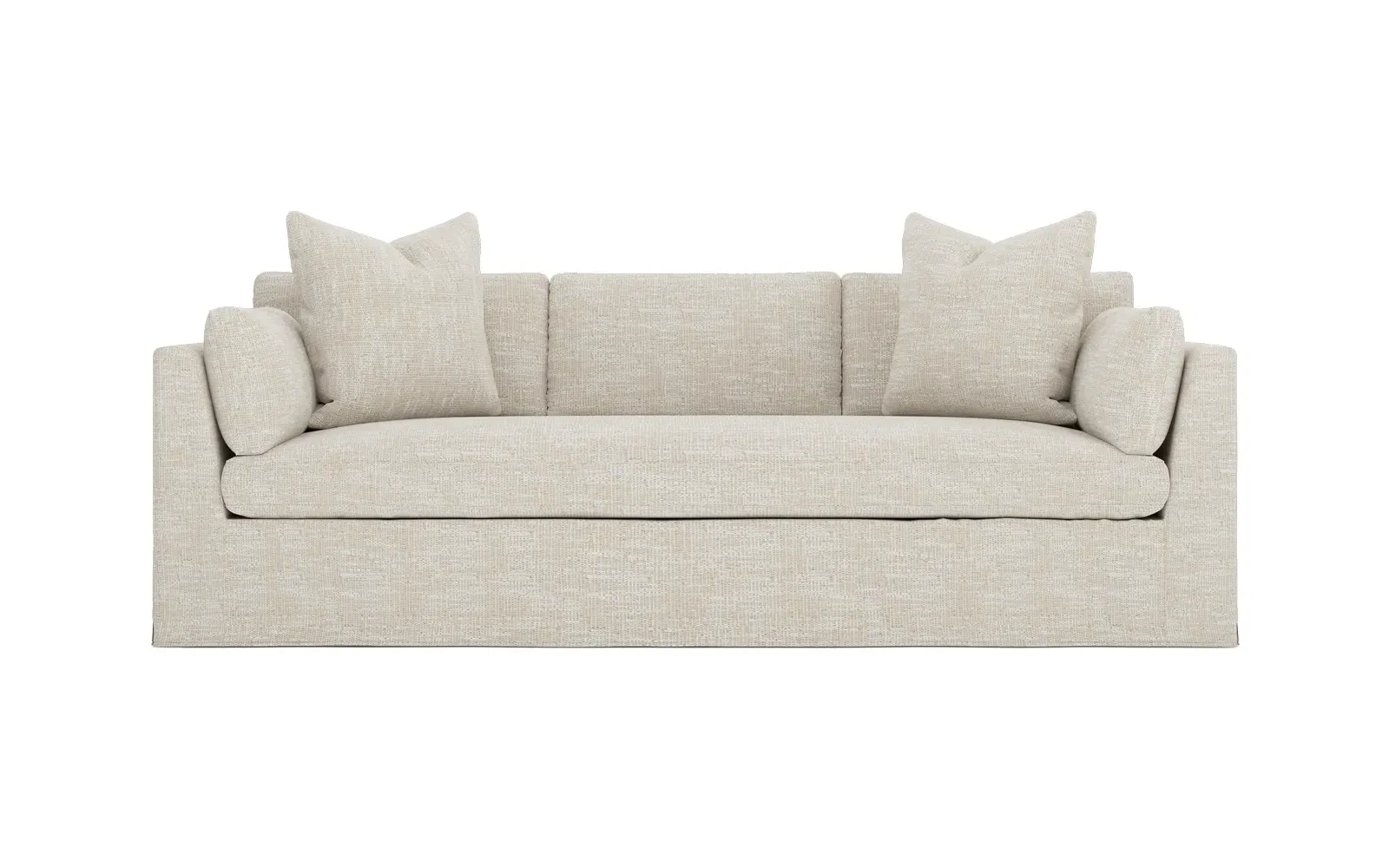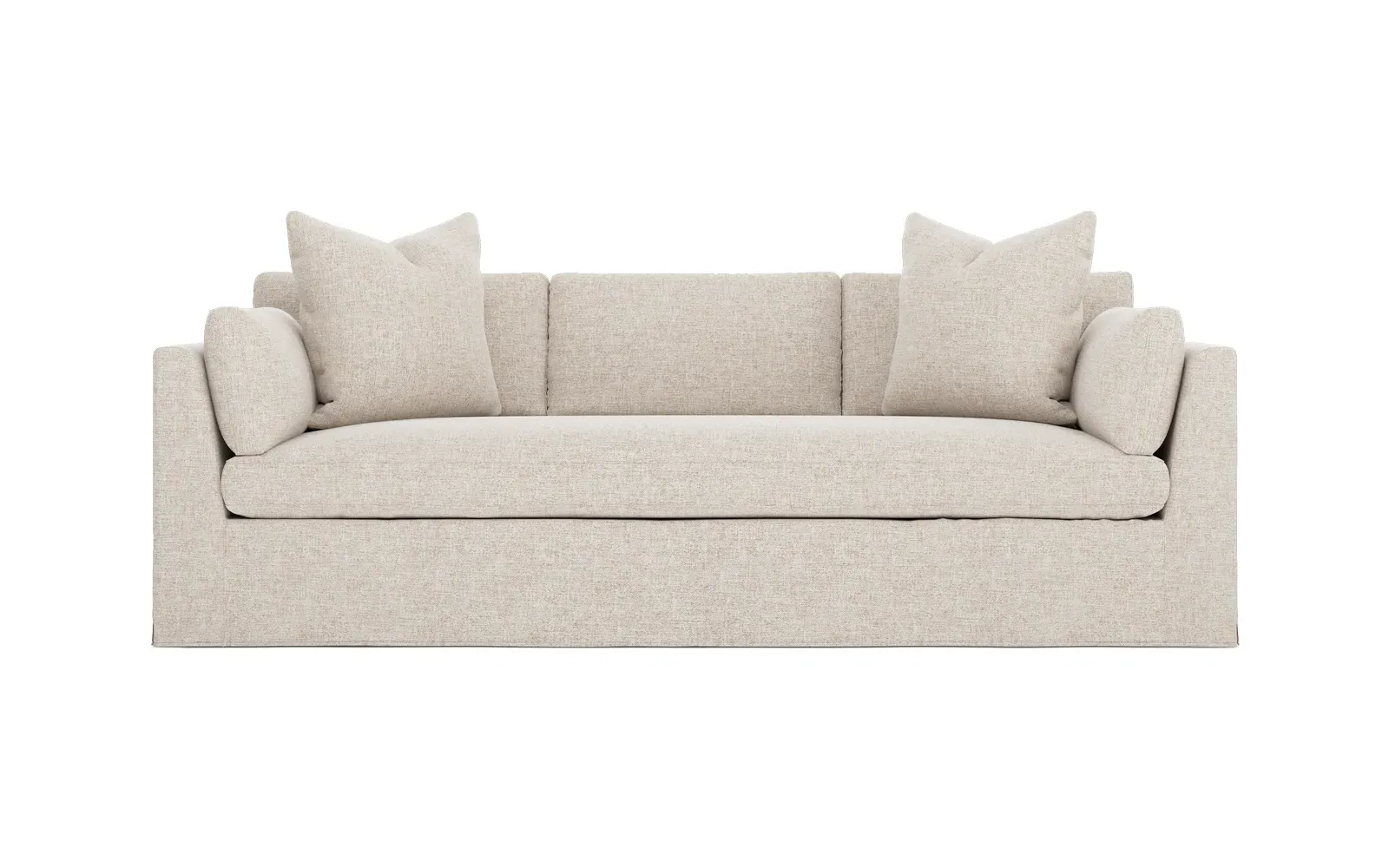 The Adelle slipcovered sofa combines comfort with its foam core surrounded by fiber, down, and feather fill. Its bench seat features two sets of pillows and gently angled arms for easy lounging, while the washable slipcover fabric adds practical appeal. The FSC-certified kiln-dried hardwood frame ensures durability, and the channel-quilted casing keeps materials evenly distributed. W251 x D97 x H89 cm.