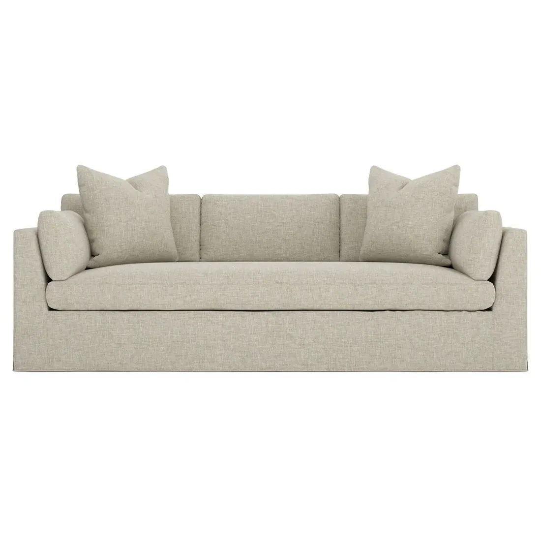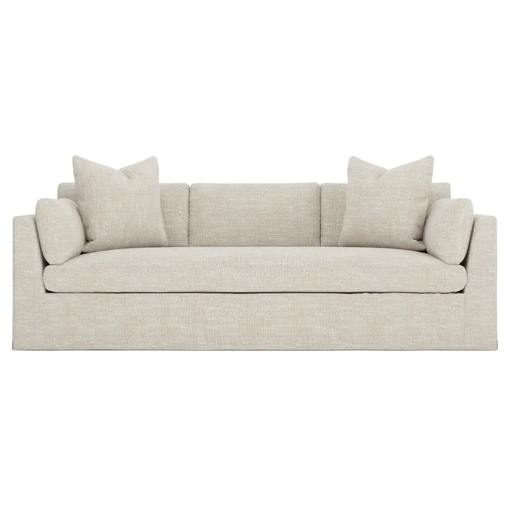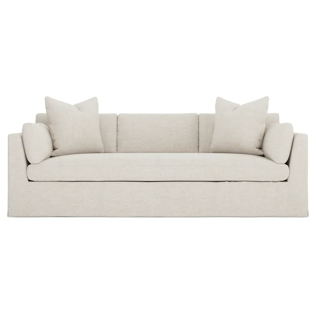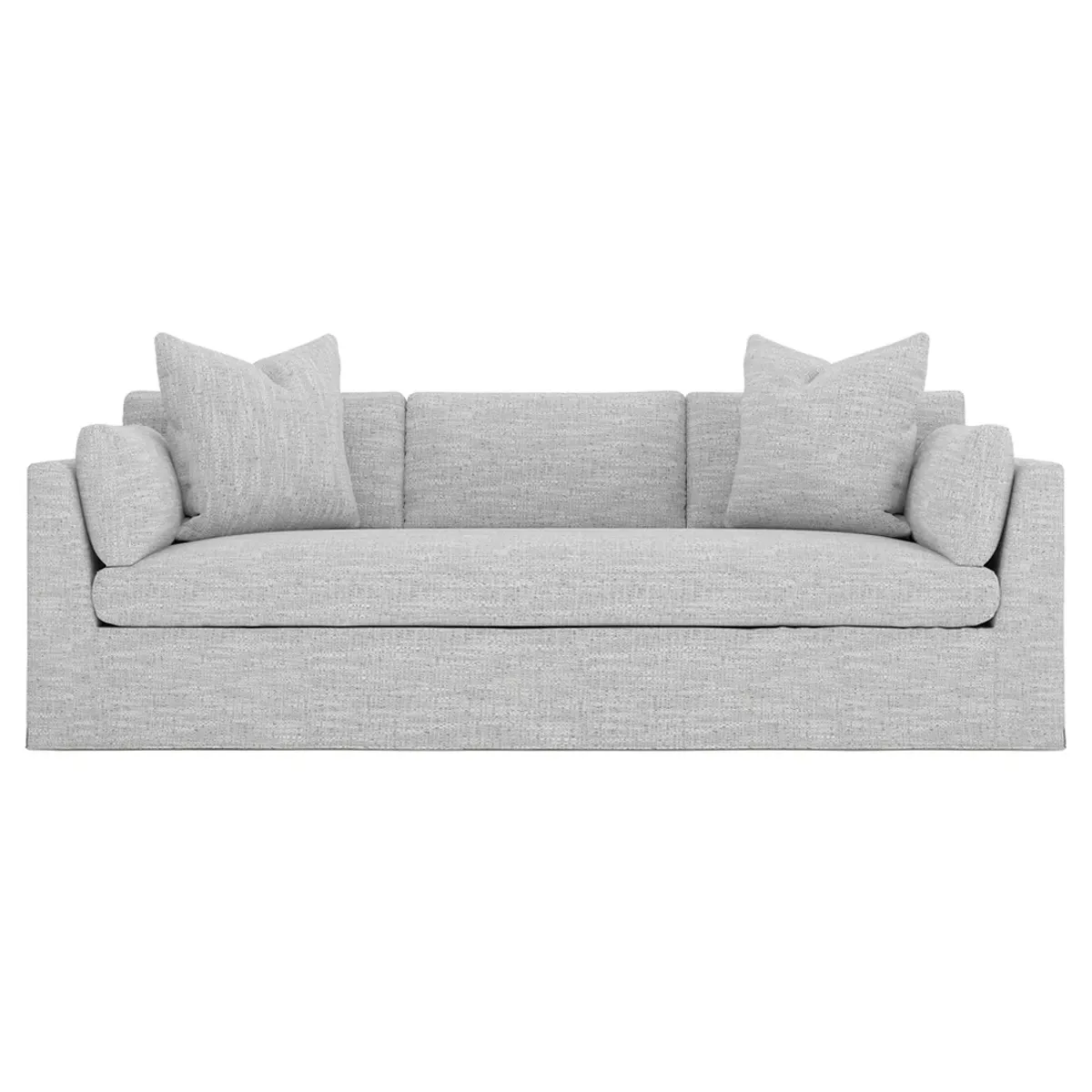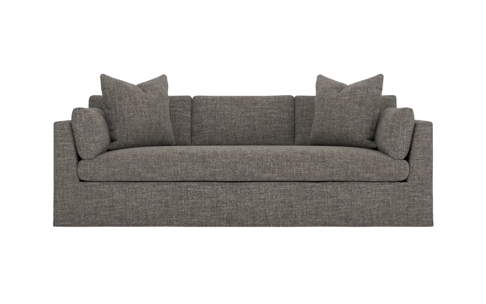 The Adelle slipcovered sofa combines comfort with its foam core surrounded by fiber, down, and feather fill. Its bench seat features two sets of pillows and gently angled arms for easy lounging, while the washable slipcover fabric adds practical appeal. The FSC-certified kiln-dried hardwood frame ensures durability, and the channel-quilted casing keeps materials evenly distributed. W251 x D97 x H89 cm.