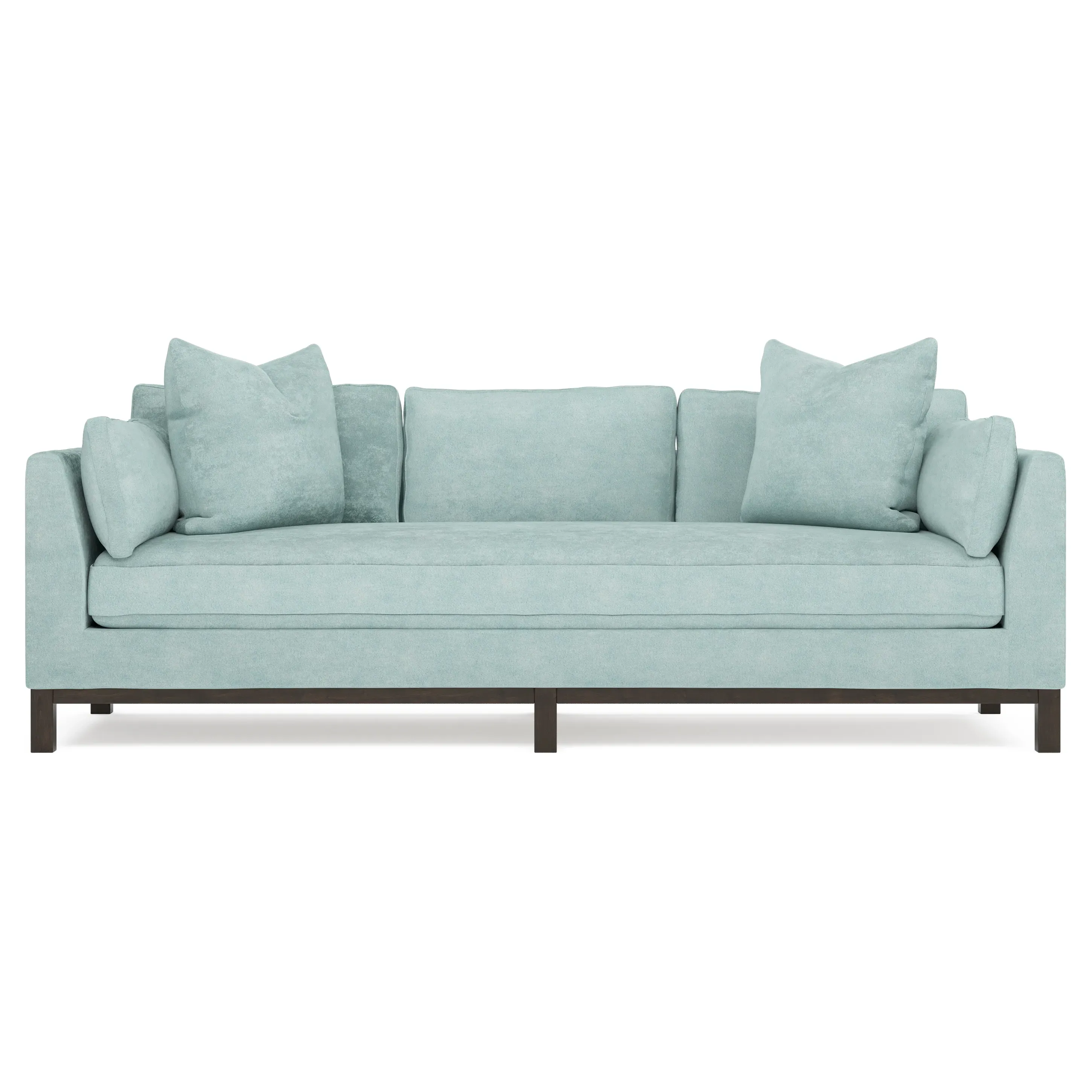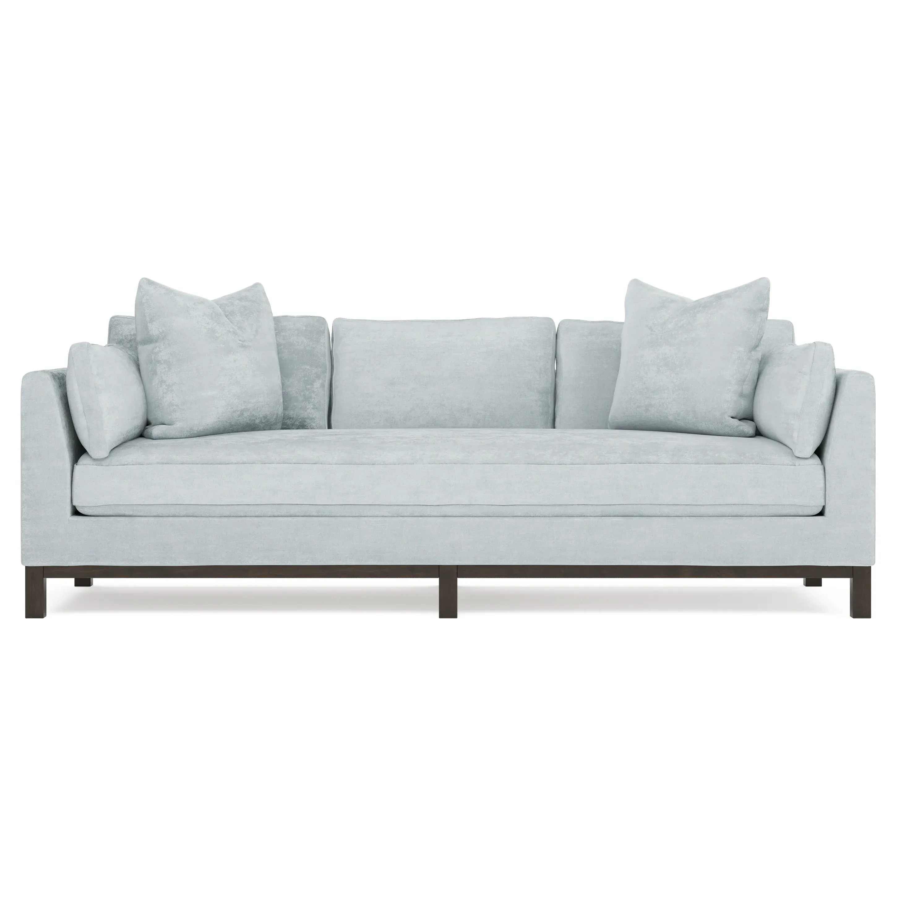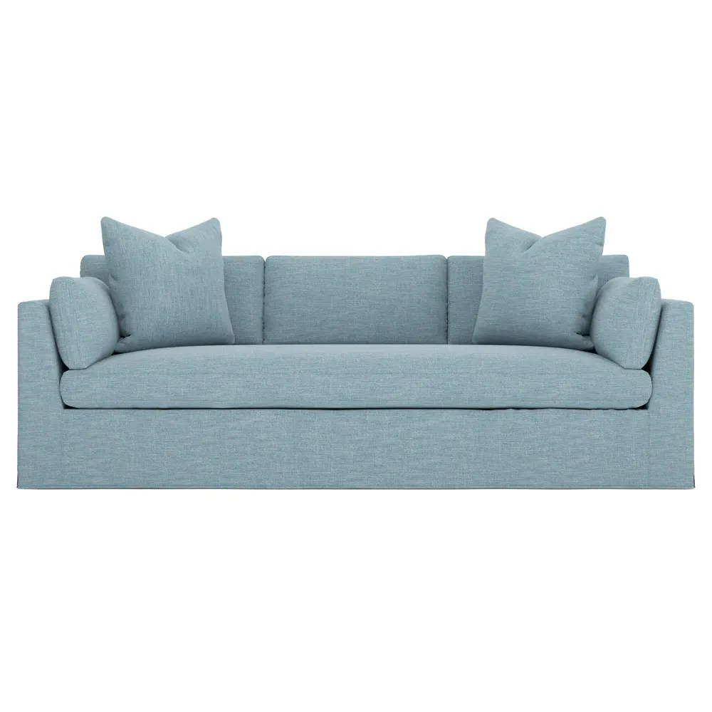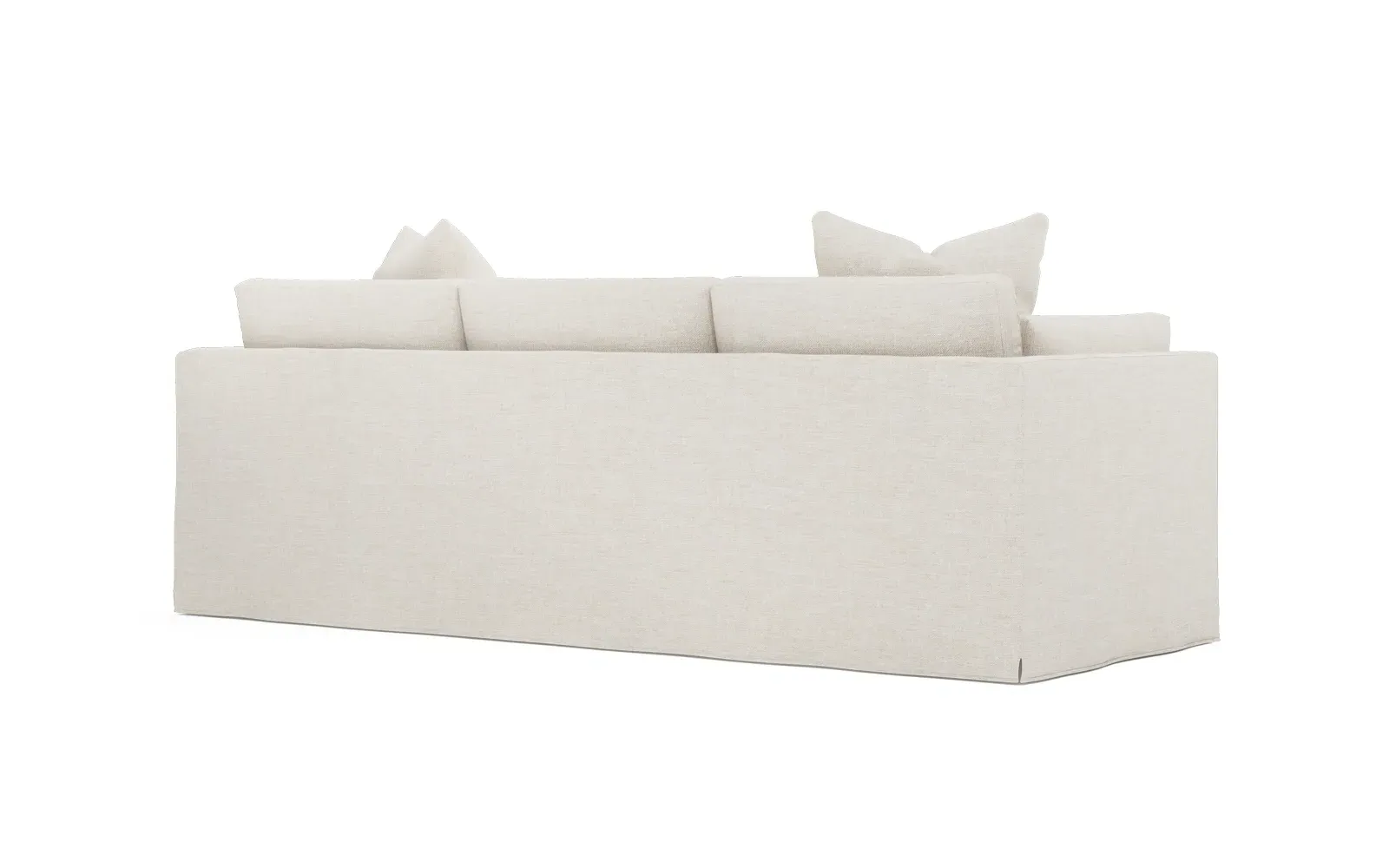 The 99” Adelle slipcovered sofa is effortlessly relaxed, with simple lines and airy, elegant draping. Plush, comfortable seating is soft yet supportive, with a foam core surrounded by a blend of fiber, down, and feather fill. Its graceful bench seat is anchored by two sets of pillows and gently angled arms for easy lounging. Choose from washable slipcover fabrics in a variety of serene hues. <b>Overall Dimensions:</b> 99" W x 38" D x 35" H. <b>Seat Dimensions:</b> 25” D x 21” H; <b>Distance Between Arms:</b> 75”; <b>Arm Height:</b> 28”. <b>Materials:</b> FSC®-certified, US-sourced, formaldehyde-free solid kiln-dried hardwood and furniture-grade laminates. <b>Cushion Fill:</b> A CertiPUR-US® certified, high-resiliency foam core wrapped with a super soft foam layer then inserted into a channel-quilted casing filled with a blend of 50% fiber, 5% down, and 45% feather. <b>Back Fill:</b> 50% fiber, 5% down, and 45% feather blend, constructed with multiple compartments to keep materials evenly distributed and securely in place.