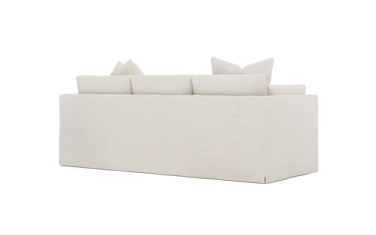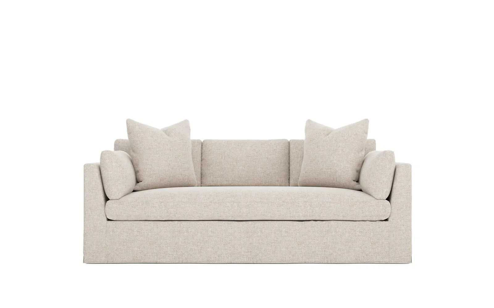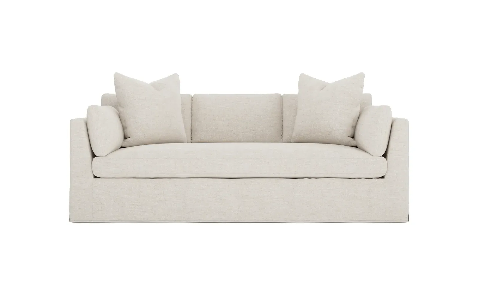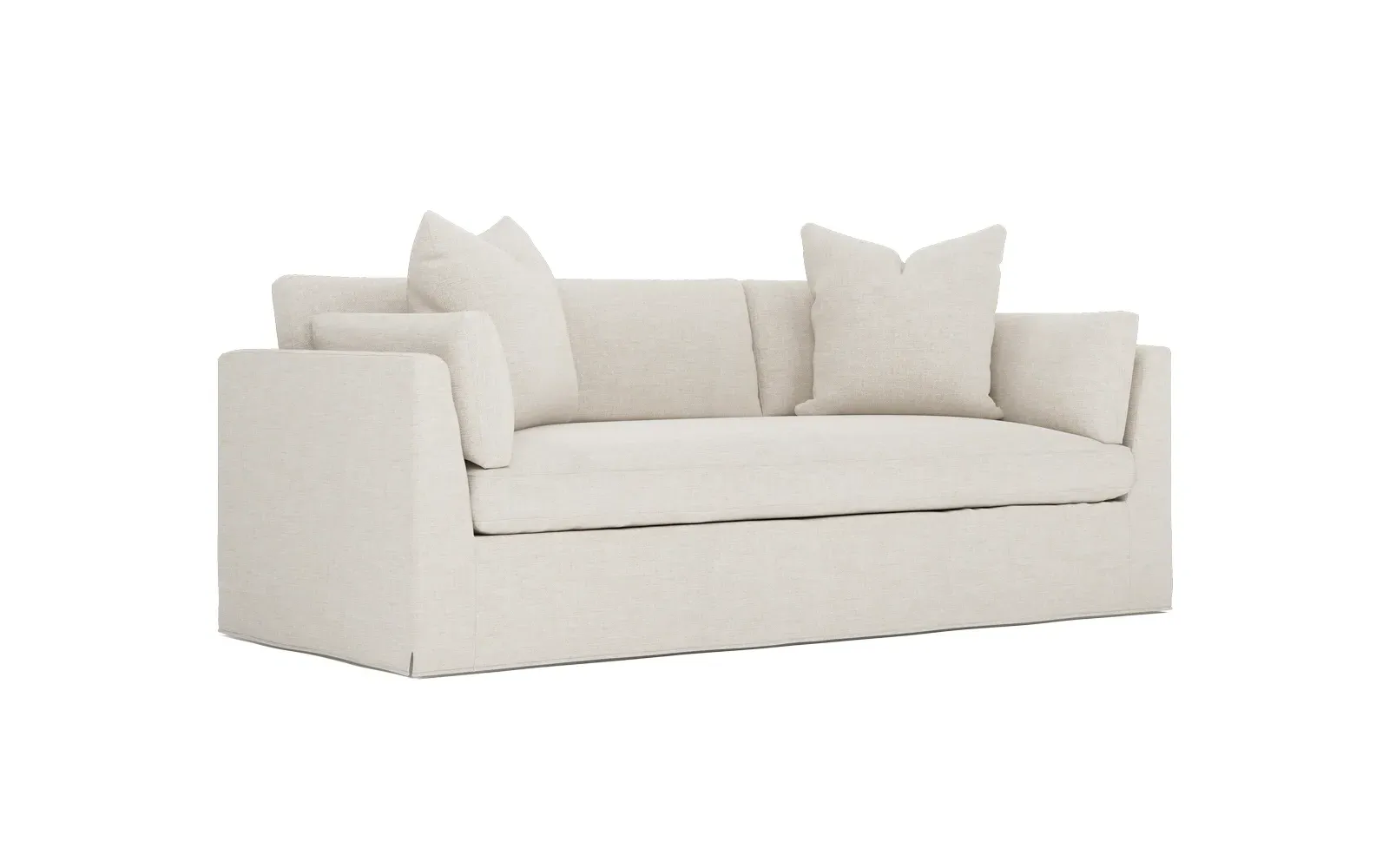 The Adelle slipcovered sofa combines comfort with its plush seating and supportive foam core surrounded by fiber, down, and feather fill. Its bench seat features two sets of pillows and gently angled arms for easy lounging, while the washable slipcover fabric adds practical appeal. The FSC-certified kiln-dried hardwood frame ensures durability, and the channel-quilted casing keeps materials evenly distributed. W229 x D97 x H89 cm.