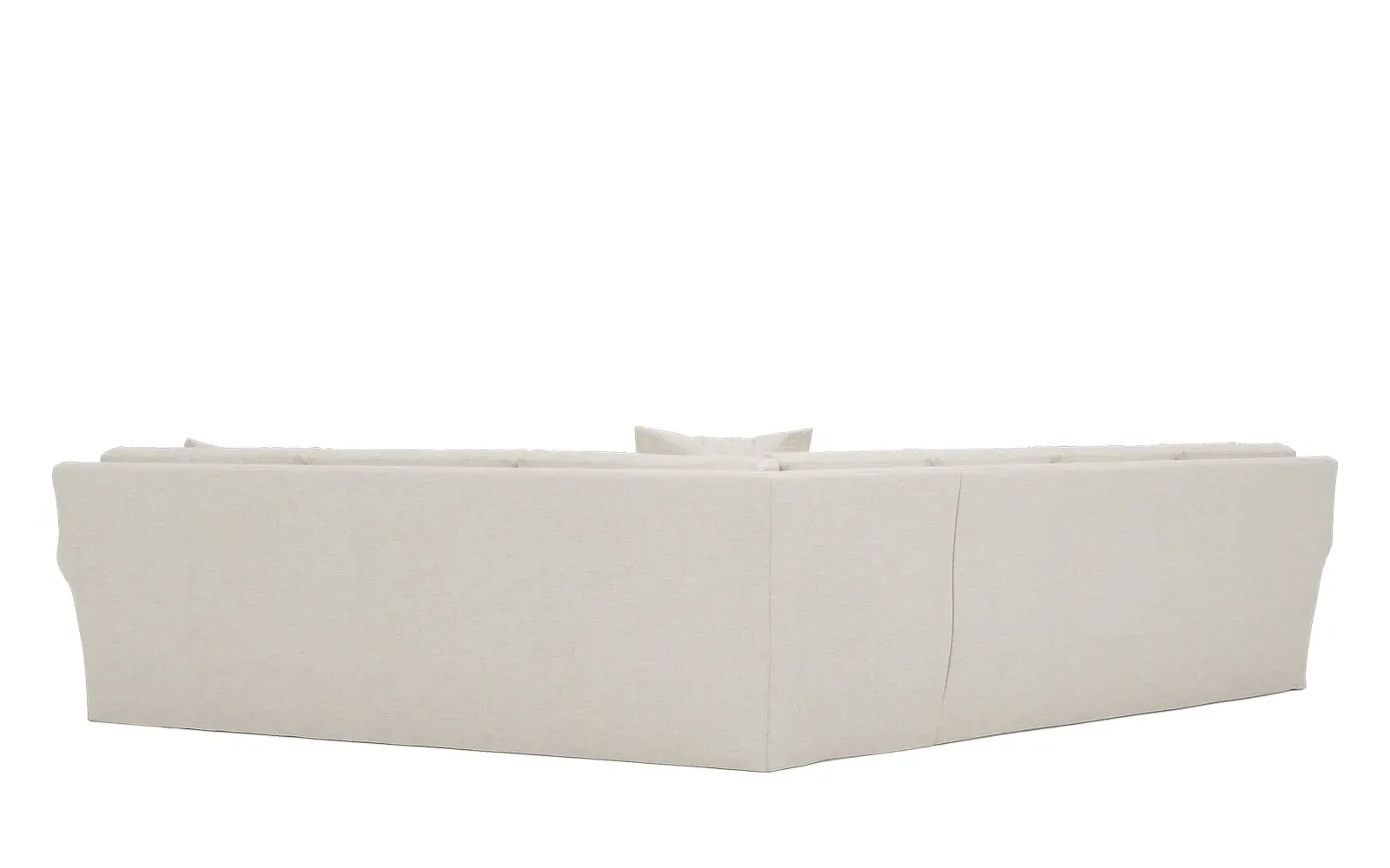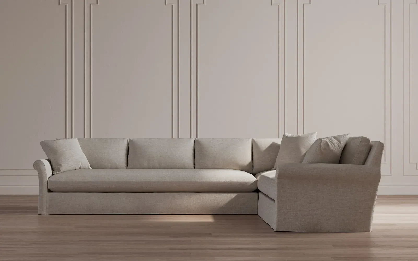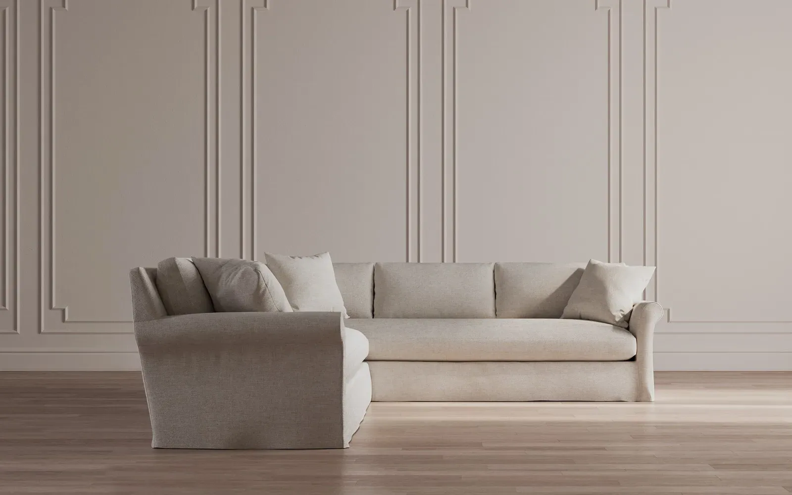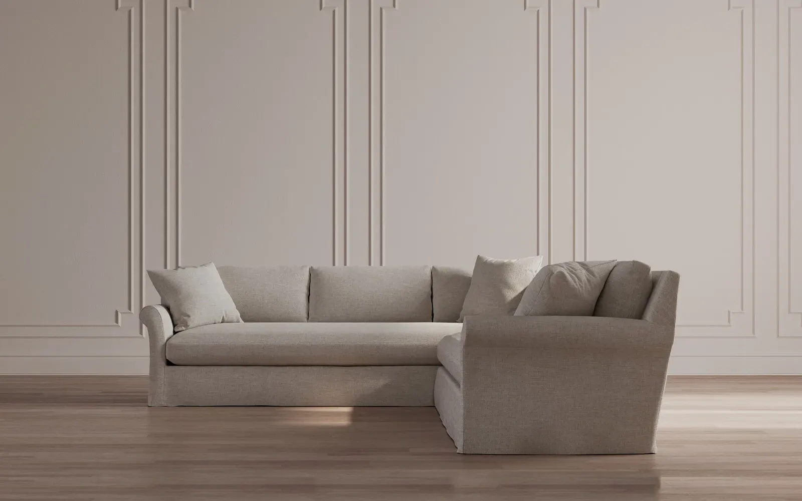 The Ameerah Corner Sectional provides generous seating with its L-shaped layout, featuring fog-colored textured weave upholstery. Its solid kiln-dried hardwood construction delivers exceptional stability, while the furniture-grade laminates add reinforcement. The sectional includes corner and end sofa pieces, and the espresso leg finish complements the neutral fabric tone. W355 x D274 x H91 cm.