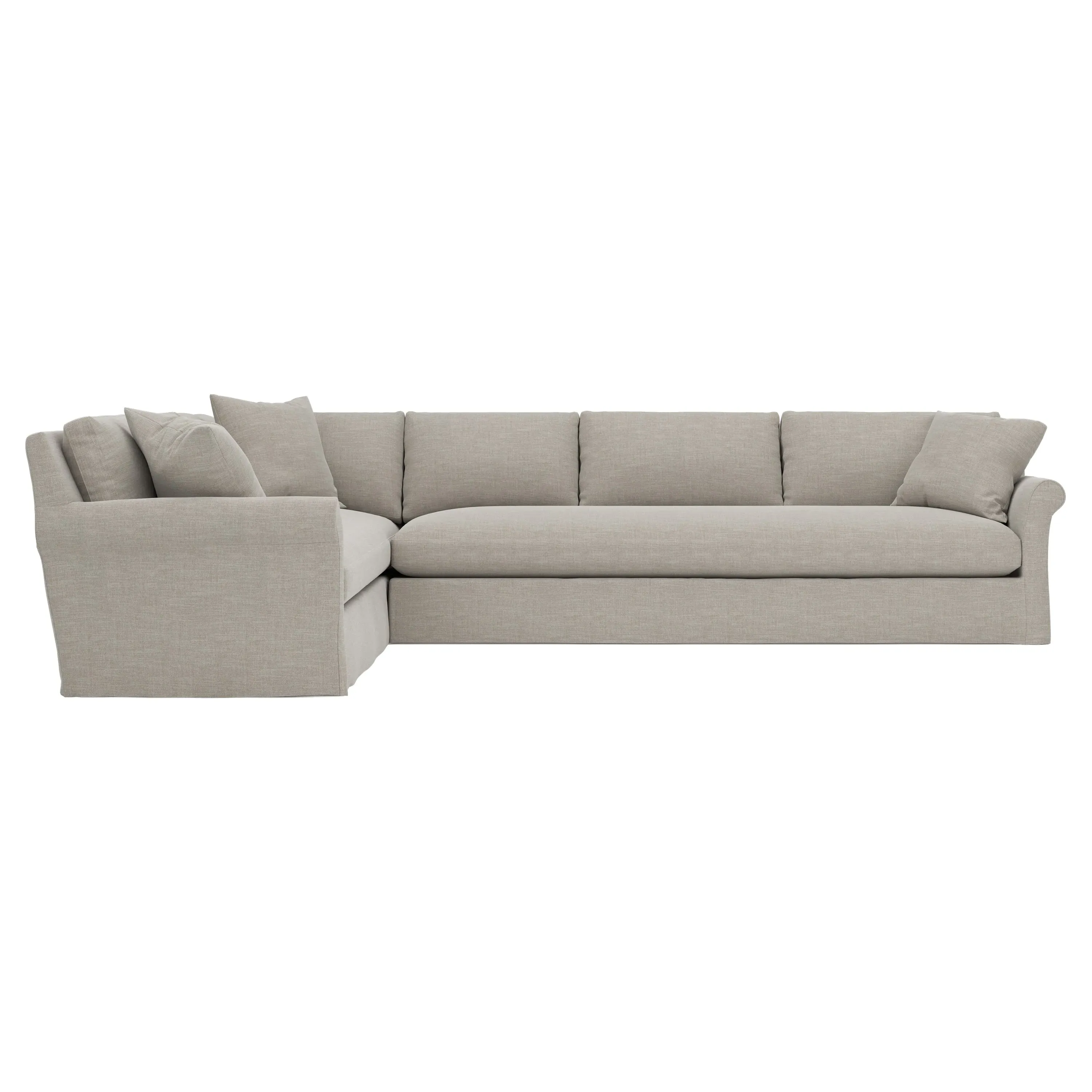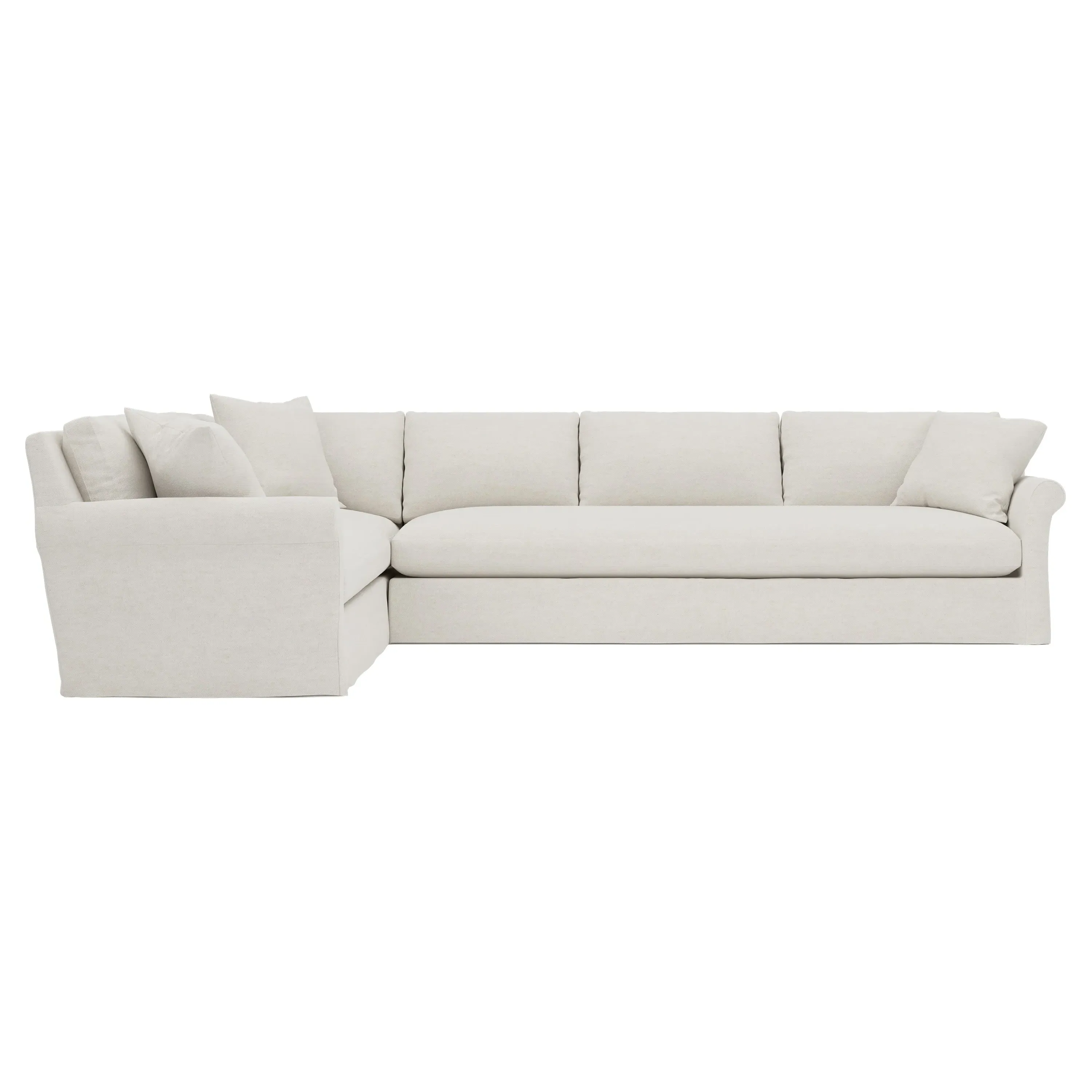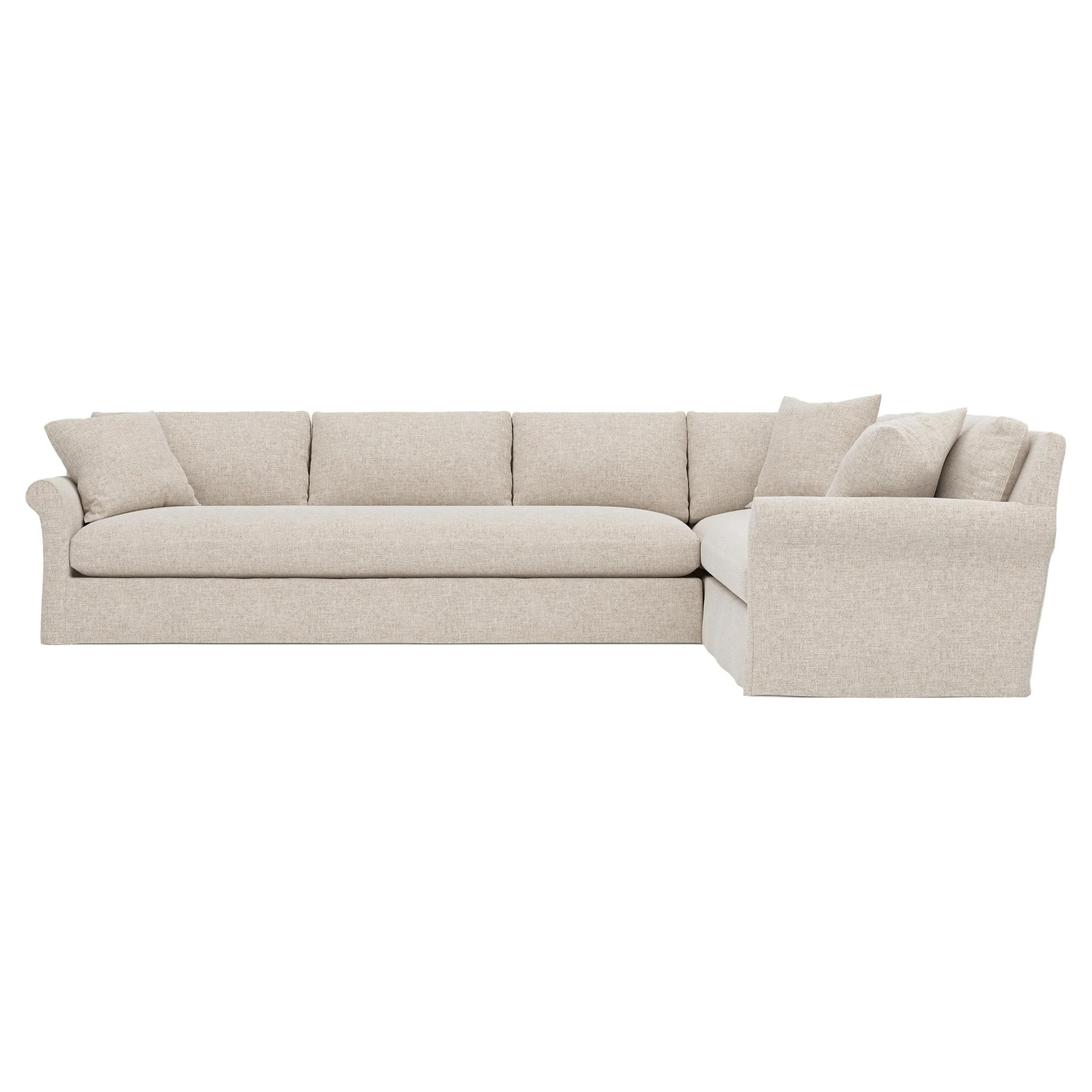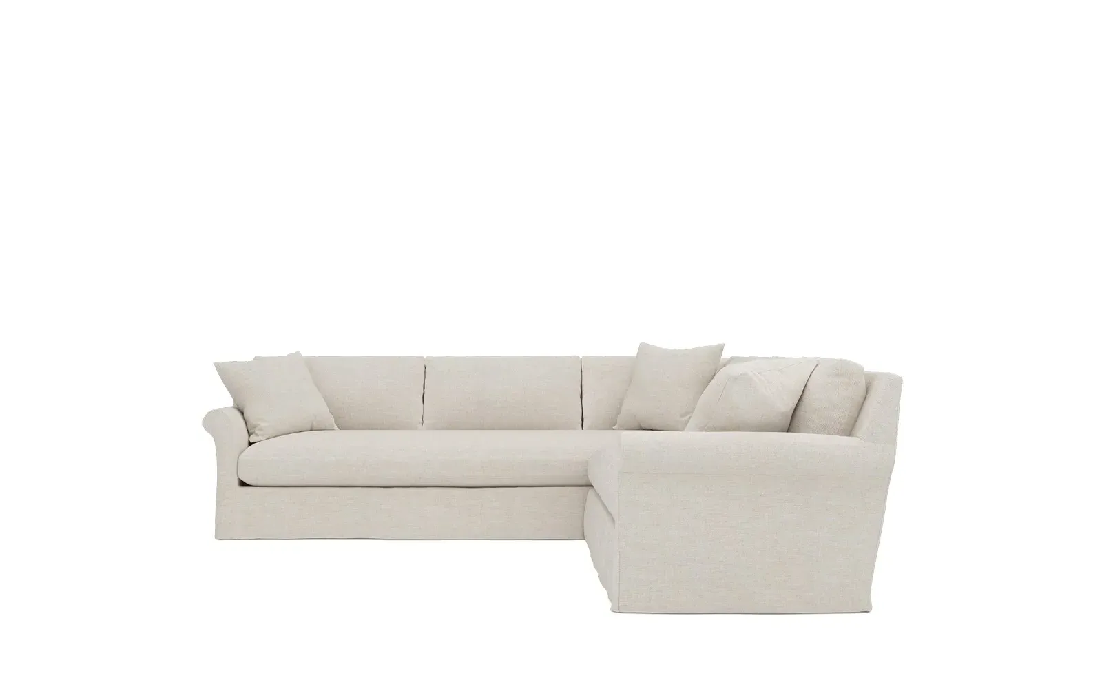 The Ameerah Corner Sectional provides generous seating with its L-shaped layout, featuring fog-colored textured weave upholstery. Its solid kiln-dried hardwood construction delivers exceptional stability, while the furniture-grade laminates add reinforcement. The sectional includes corner and end sofa pieces, and the espresso leg finish complements the neutral fabric tone. W355 x D274 x H91 cm.