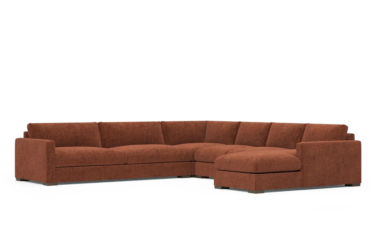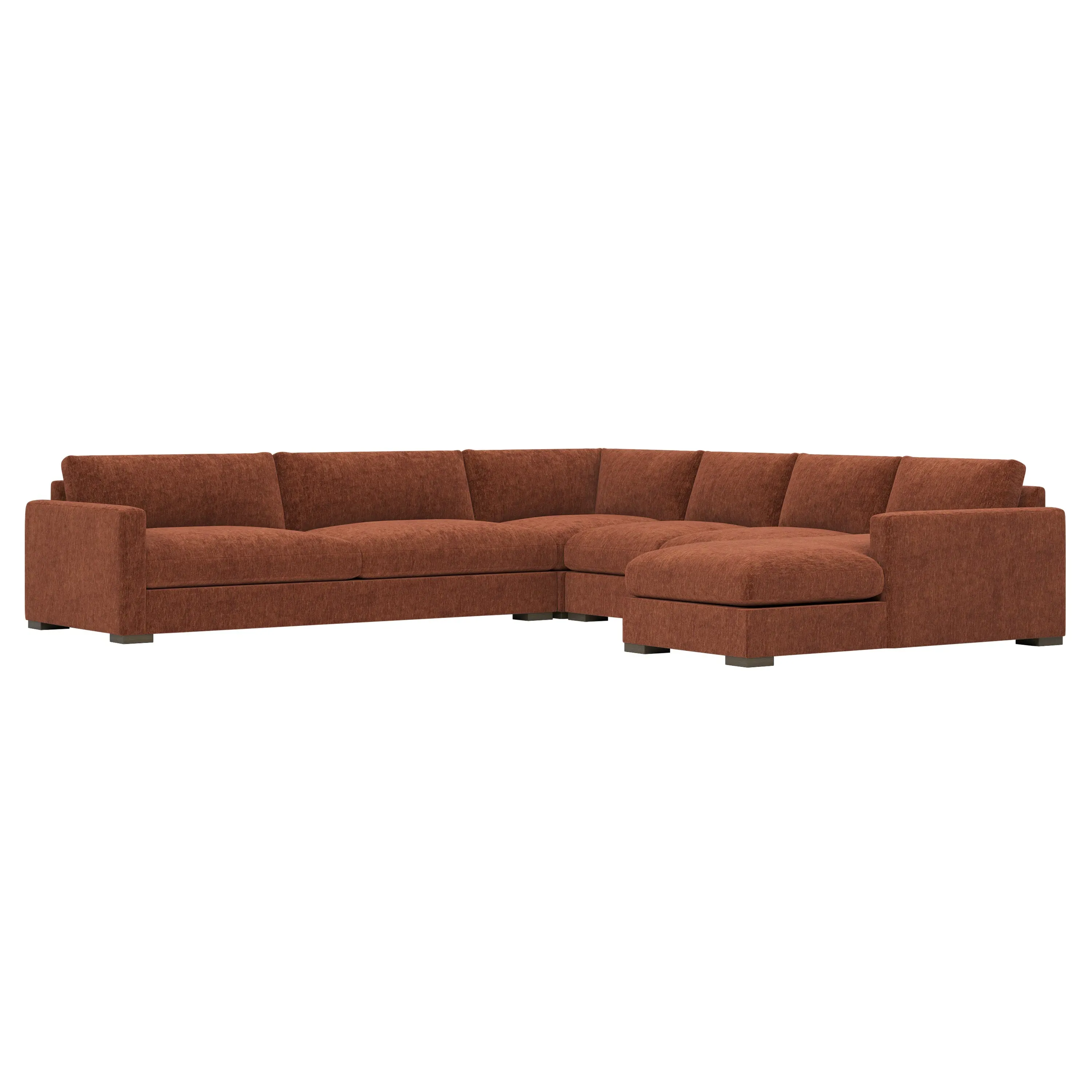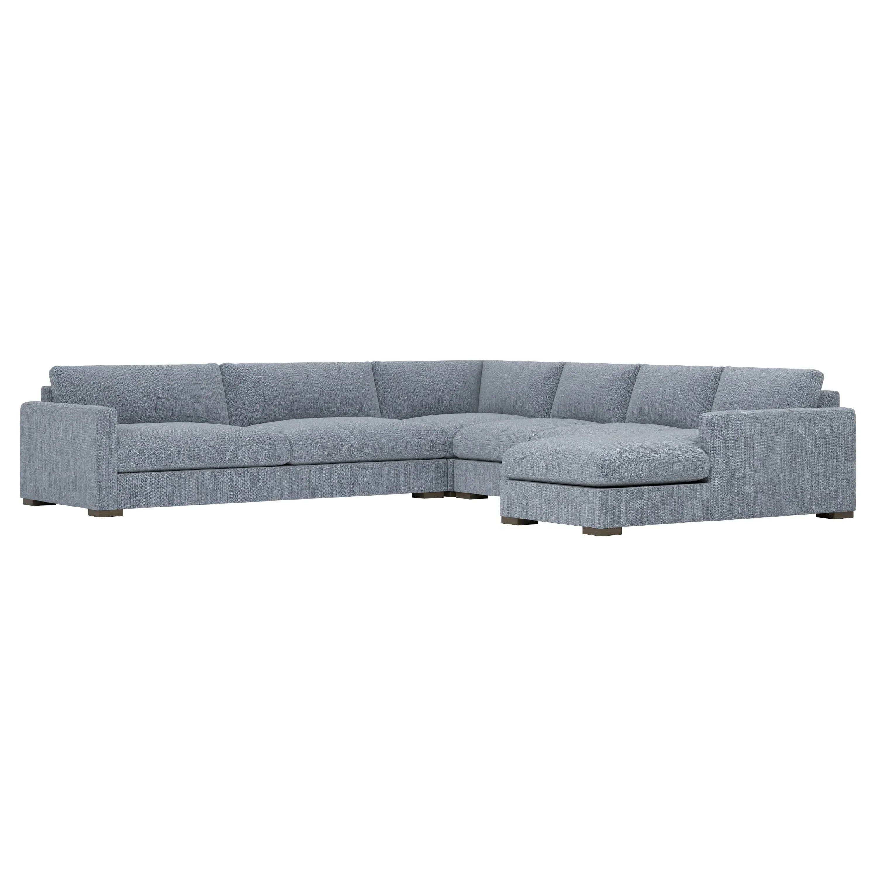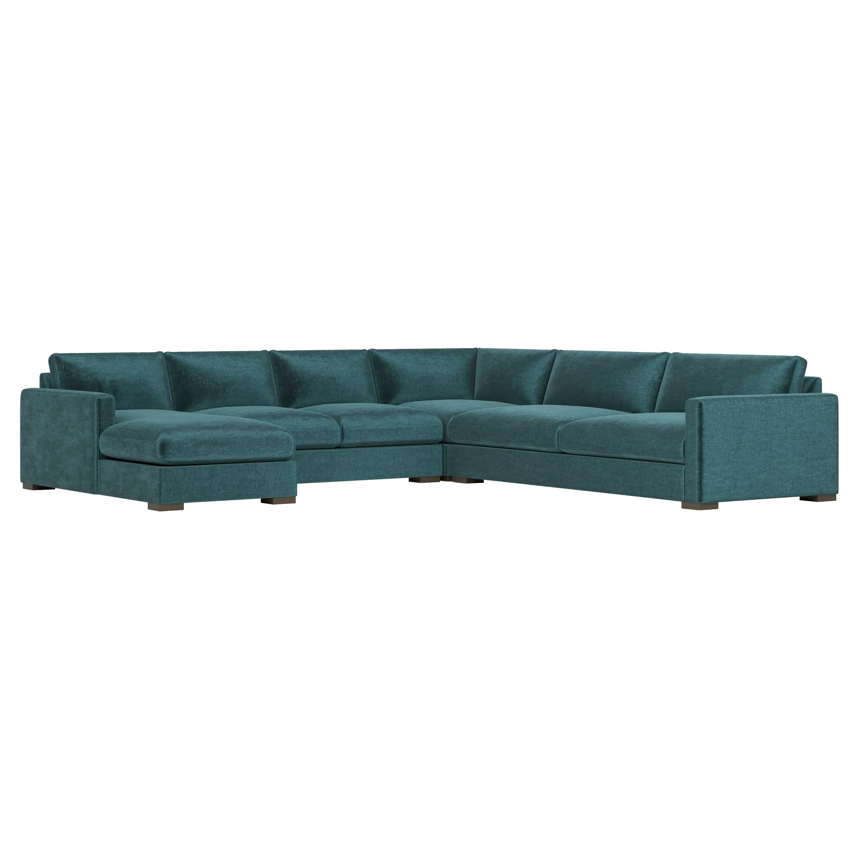 The Curtis U-Chaise Sectional offers spacious seating with its comprehensive four-piece configuration, featuring a left chaise, armless sofa, corner seat, and right one-arm sofa. Its hardwood and plywood construction provides lasting durability, while the dove tail finish adds refined detail. The sectional accommodates multiple seating arrangements with generous seat depth, and the low-profile legs ensure stability. W350 x D350 x H86 cm.
