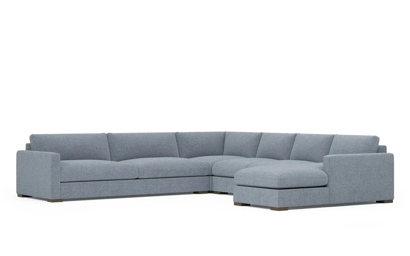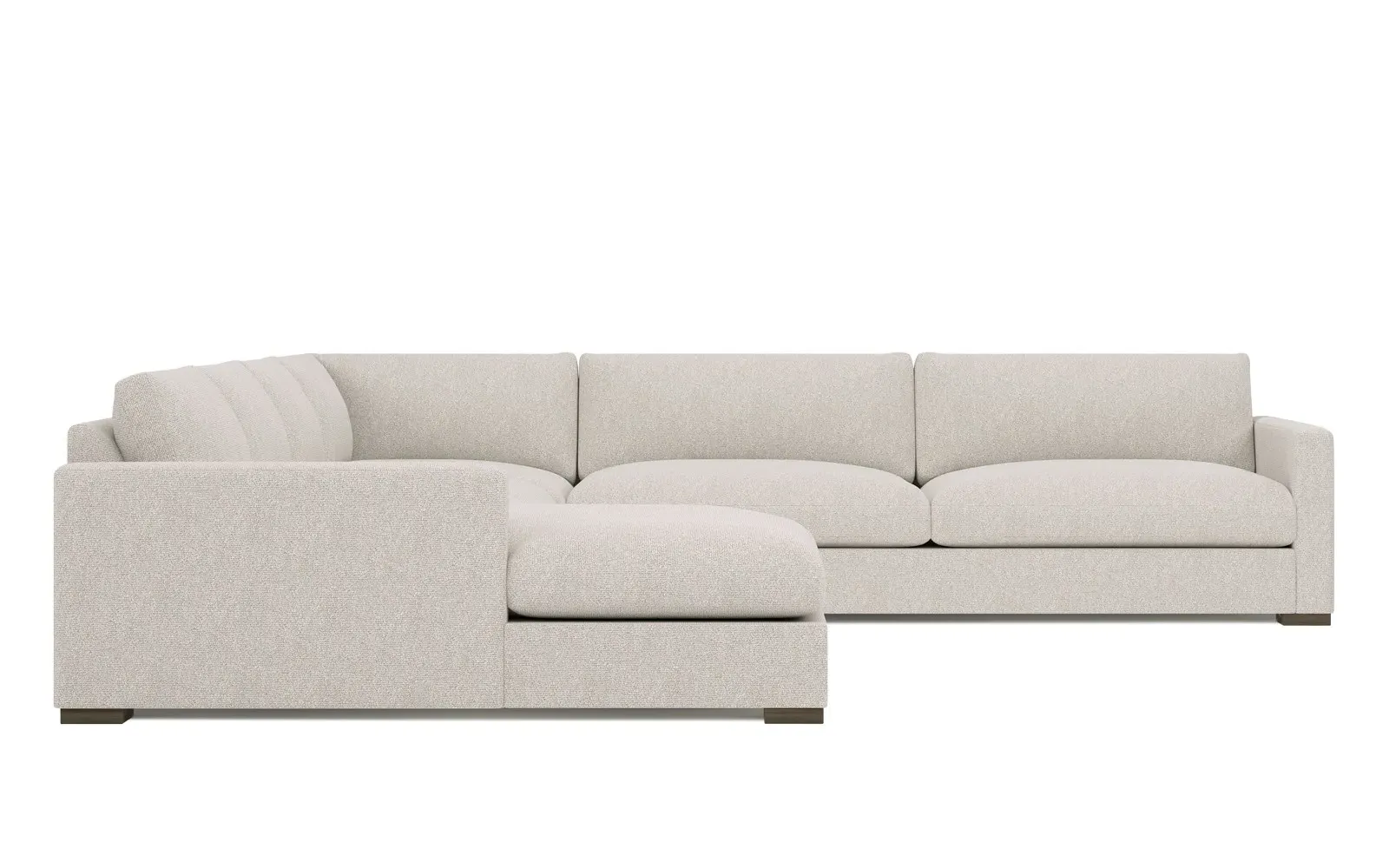 <b>Overall Dimensions:</b> 138" W x 138" D x 34" H. <b>Chaise Dimensions:</b> 35" W x 60" D x 34" H; <b>Armless Sofa Dimensions:</b> 60" W x 43" D x 34" H; <b>Corner Seat Dimensions:</b> 43" W x 43" D x 34" H; <b>One-Arm Sofa Dimensions:</b> 95" W x 43" D x 34" H; <b>Seat Dimensions:</b> 28" D x 18.5" H; <b>Arm Height:</b> 24.5”; <b>Leg Height:</b> 2”. <b>Materials:</b> Hardwood and plywood. <b>Material Finish:</b> Dove Tail. <b>Pieces Included:</b> Left chaise, armless sofa, corner seat, right one-arm sofa.
