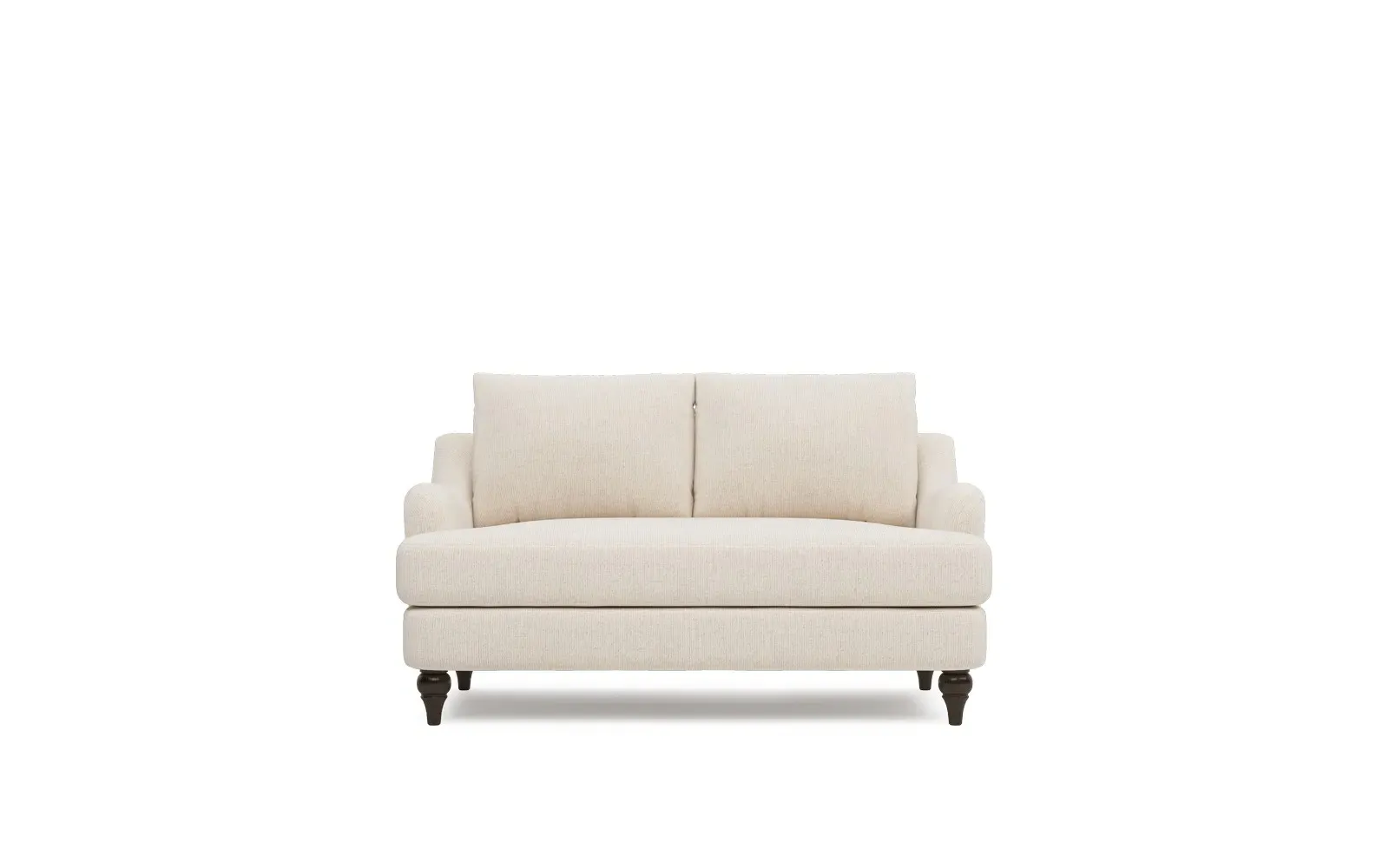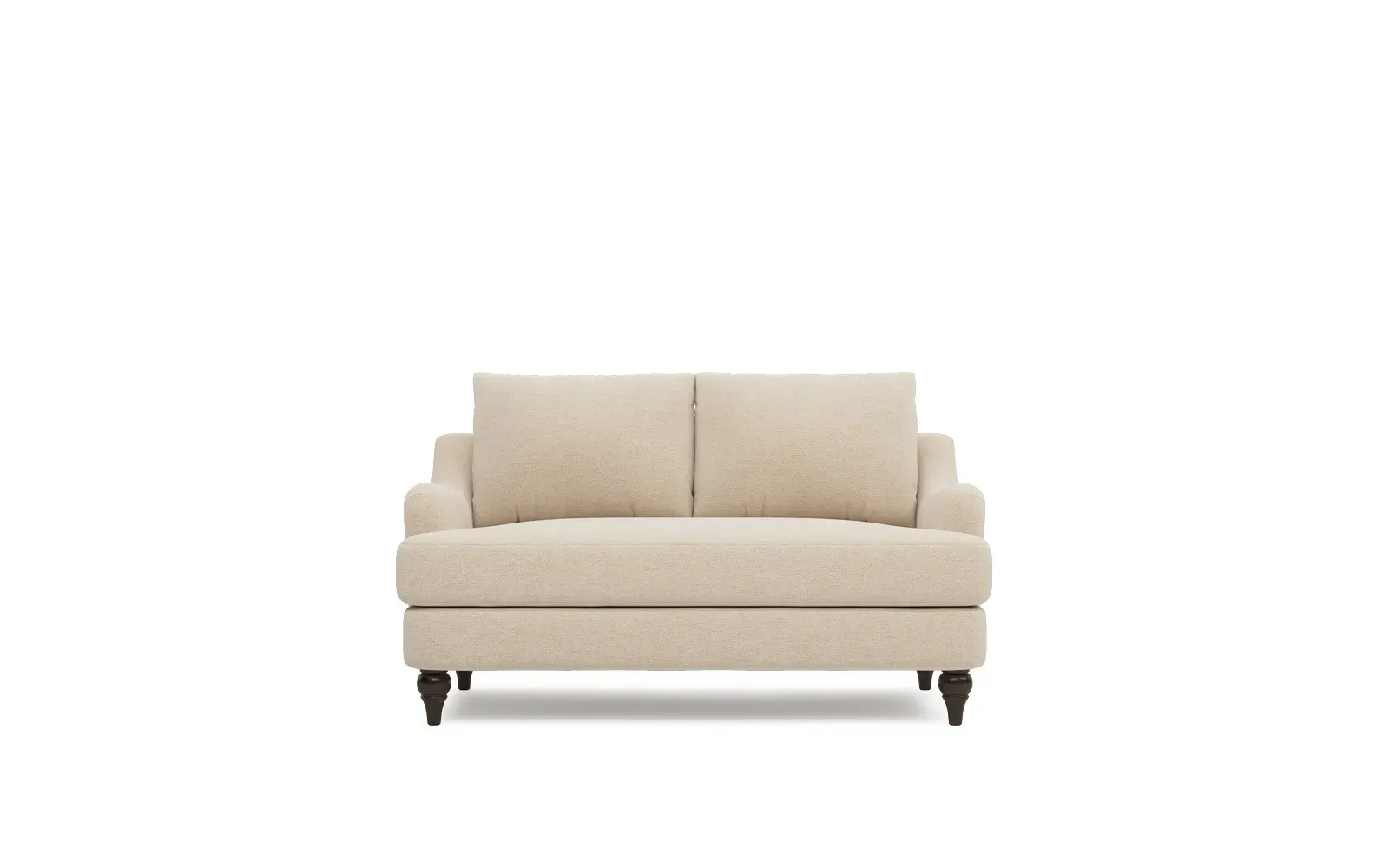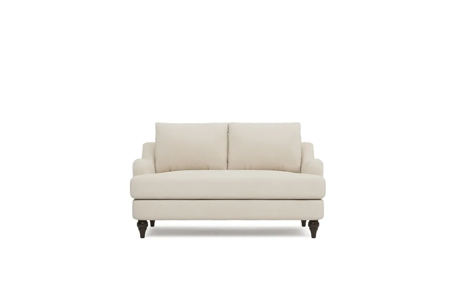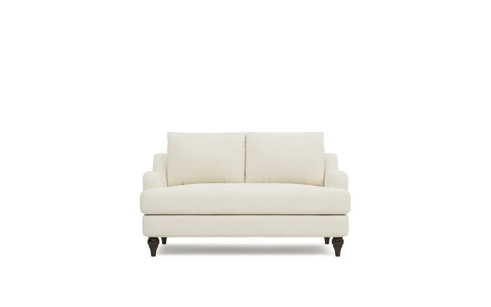 A Kathy Kuo Home exclusive, our 60” Willett loveseat feels timeless and fresh, a perfect transitional piece for living rooms of any style. Turned wood legs and sloped, gently rounded arms add a charming, nostalgic feel, while the elongated bench seat offers a clean, sophisticated look. We designed Willett with a custom cushion fill—hypoallergenic Trillium® fiber holds its shape and offers all the comfort of down without the fluffing maintenance. <b>Overall Dimensions:</b> 60" W x 38" D x 35" H. <b>Seat Dimensions:</b> 50” W x 23” D x 19” H; <b>Arm Height:</b> 24”; <b>Leg Height:</b> 5”. <b>Materials:</b> Poplar and plywood. <b>Leg Finish:</b> Dark Espresso. <b>Cushion Fill: A new KKH custom sit features Trillium®, a hypoallergenic poly fiber that offers all the benefits and comfort of down, without the escaping feathers or fluffing maintenance.</b> Trillium® fill is wrapped around a CertiPUR-US® certified, high-resiliency foam core, which provides just enough structure and ensures longevity.