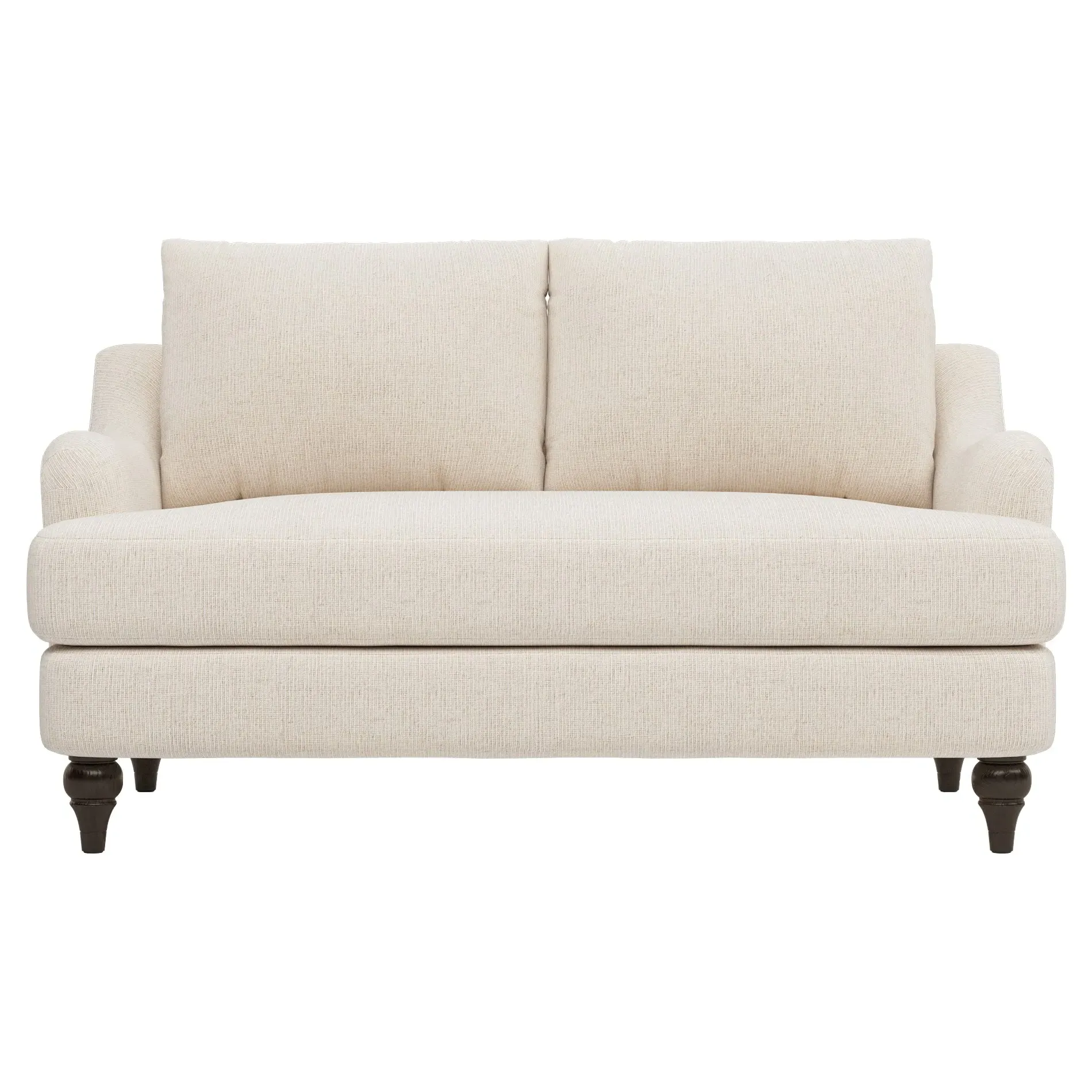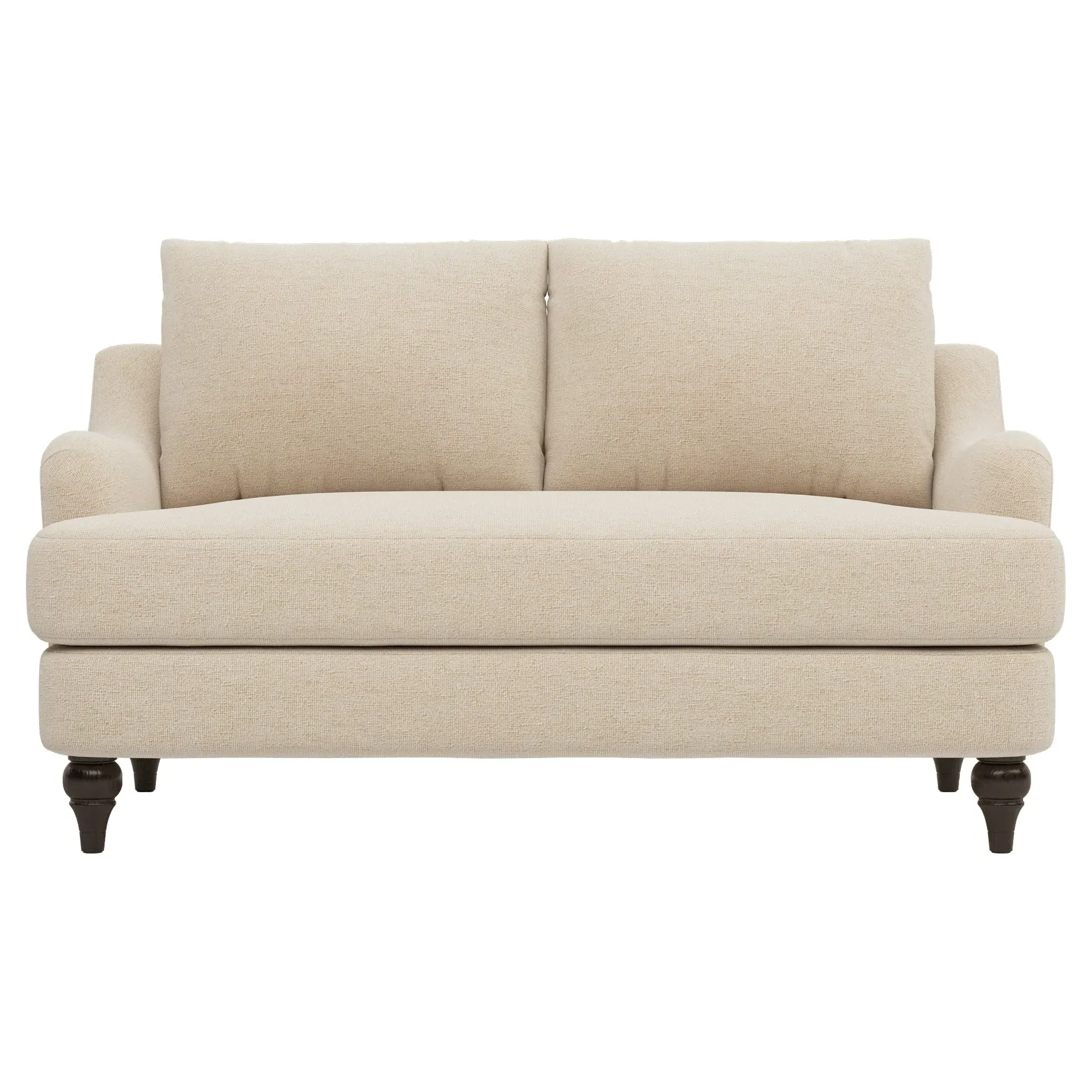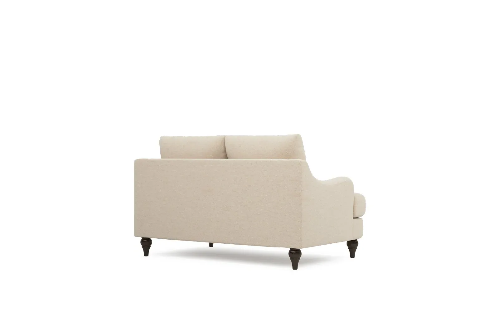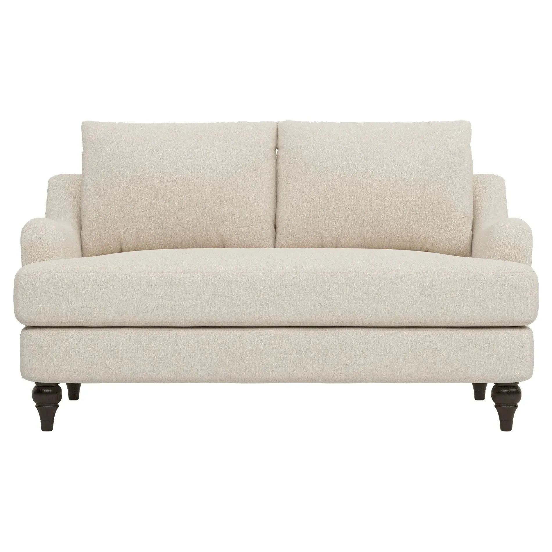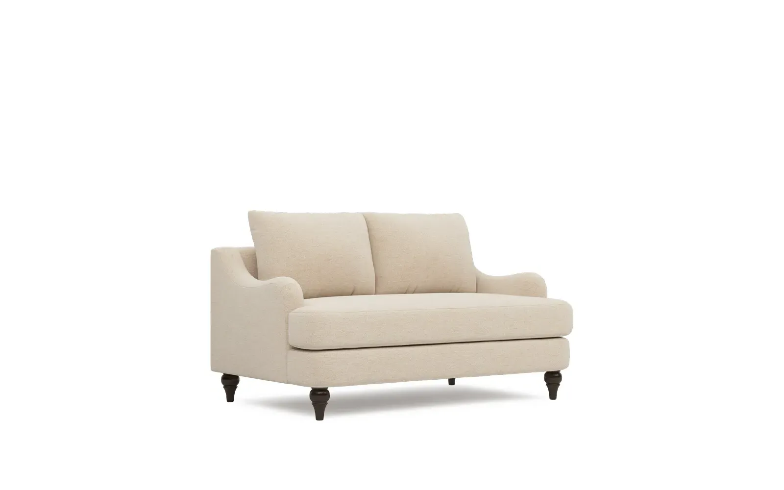 A Kathy Kuo Home exclusive, our 60” Willett loveseat feels timeless and fresh, a perfect transitional piece for living rooms of any style. Turned wood legs and sloped, gently rounded arms add a charming, nostalgic feel, while the elongated bench seat offers a clean, sophisticated look. We designed Willett with a custom cushion fill—hypoallergenic Trillium® fiber holds its shape and offers all the comfort of down without the fluffing maintenance. <b>Overall Dimensions:</b> 60" W x 38" D x 35" H. <b>Seat Dimensions:</b> 50” W x 23” D x 19” H; <b>Arm Height:</b> 24”; <b>Leg Height:</b> 5”. <b>Materials:</b> Poplar and plywood. <b>Leg Finish:</b> Dark Espresso. <b>Cushion Fill: A new KKH custom sit features Trillium®, a hypoallergenic poly fiber that offers all the benefits and comfort of down, without the escaping feathers or fluffing maintenance.</b> Trillium® fill is wrapped around a CertiPUR-US® certified, high-resiliency foam core, which provides just enough structure and ensures longevity.
