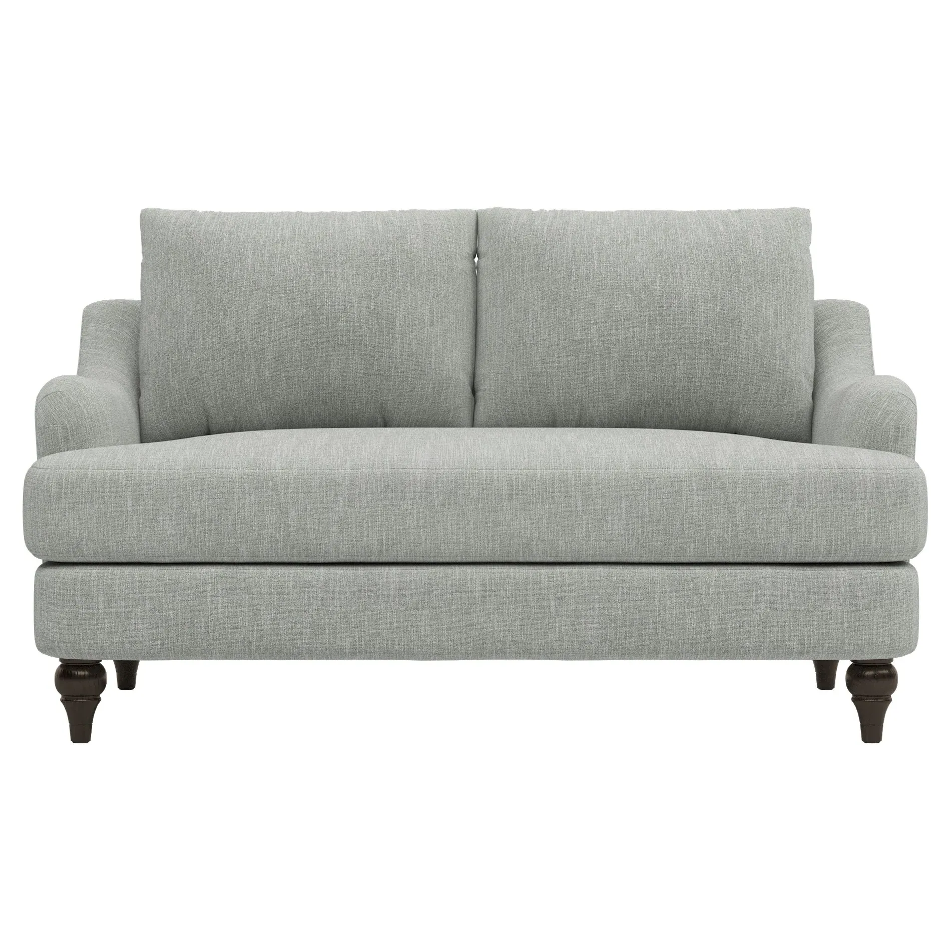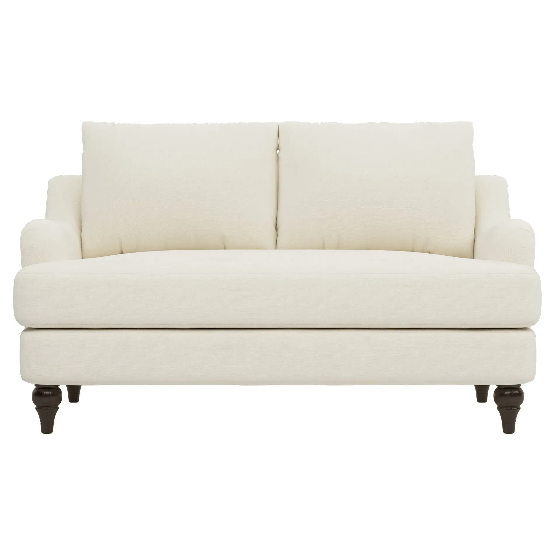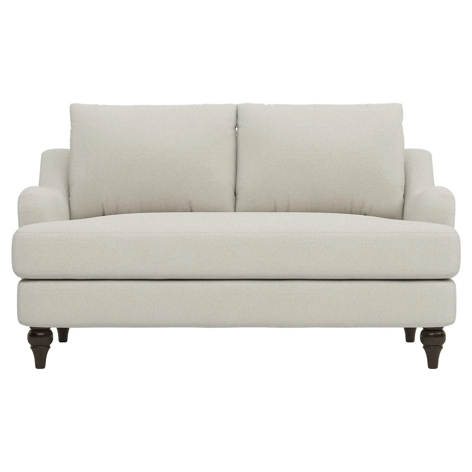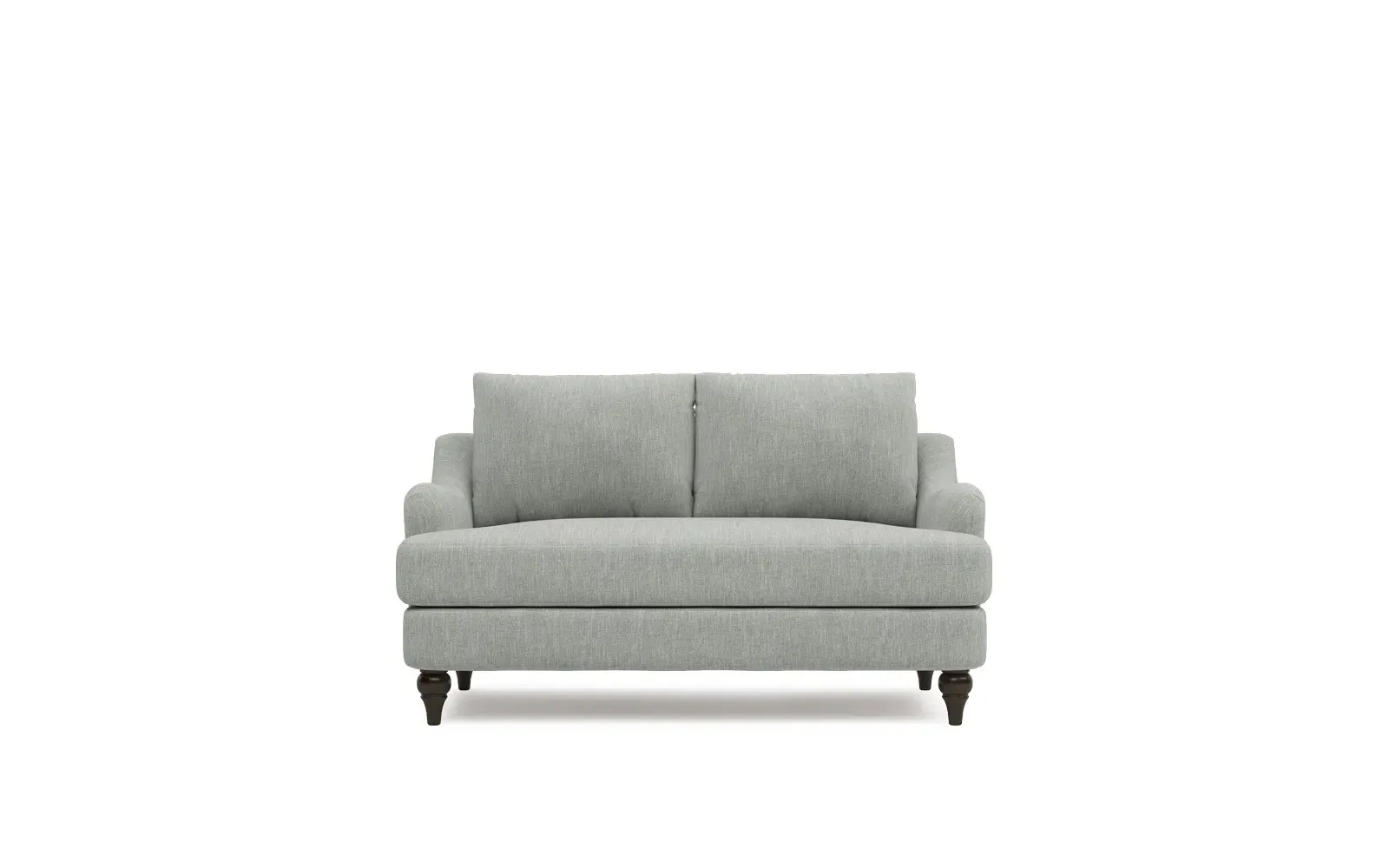 A Kathy Kuo Home exclusive, our 60” Willett loveseat feels timeless and fresh, a perfect transitional piece for living rooms of any style. Turned wood legs and sloped, gently rounded arms add a charming, nostalgic feel, while the elongated bench seat offers a clean, sophisticated look. We designed Willett with a custom cushion fill—hypoallergenic Trillium® fiber holds its shape and offers all the comfort of down without the fluffing maintenance. <b>Overall Dimensions:</b> 60" W x 38" D x 35" H. <b>Seat Dimensions:</b> 50” W x 23” D x 19” H; <b>Arm Height:</b> 24”; <b>Leg Height:</b> 5”. <b>Materials:</b> Poplar and plywood. <b>Leg Finish:</b> Dark Espresso. <b>Cushion Fill: A new KKH custom sit features Trillium®, a hypoallergenic poly fiber that offers all the benefits and comfort of down, without the escaping feathers or fluffing maintenance.</b> Trillium® fill is wrapped around a CertiPUR-US® certified, high-resiliency foam core, which provides just enough structure and ensures longevity.