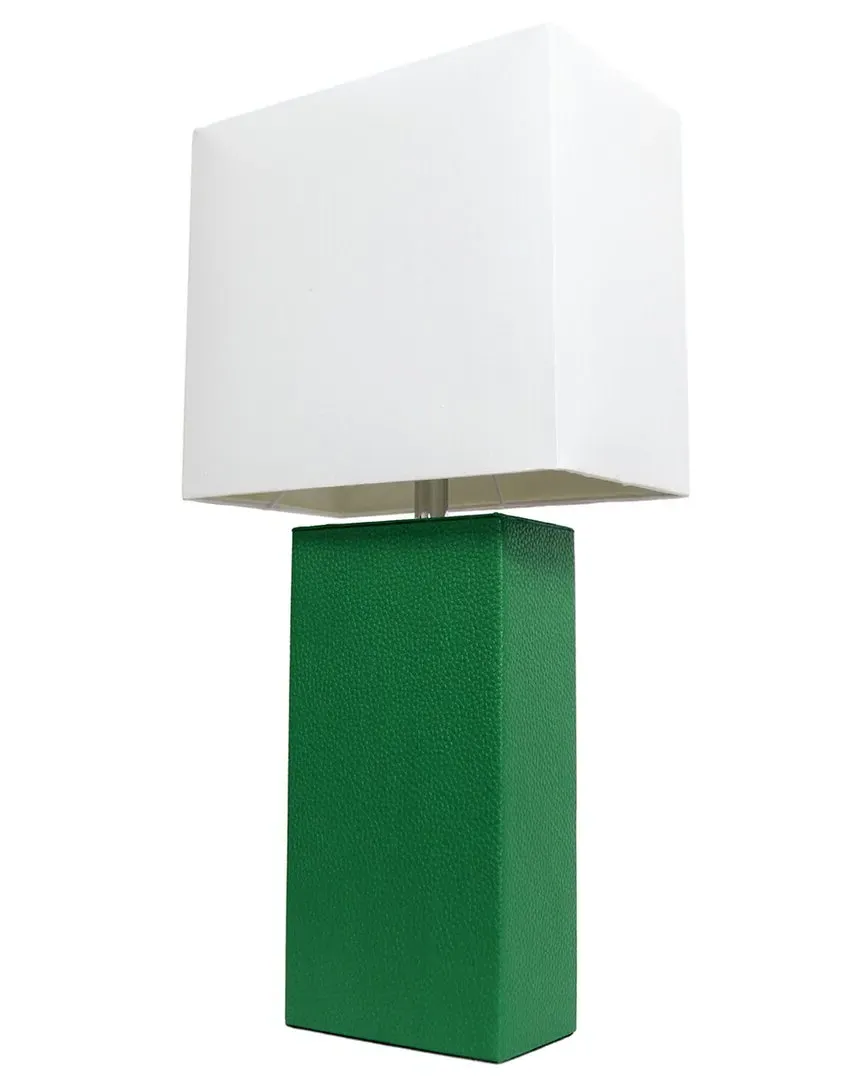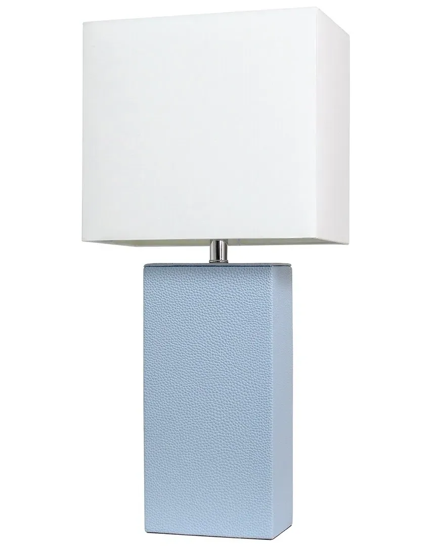 Color/finish: aqua Includes 1 x rectangle shape white fabric shade for a clean, fresh look; Includes 1 x leather wrapped rectangular base; Features a push pin on socket of the lamp for accessibility; Requires 1 x 60 watt type A19 medium based bulb (not included); Lamp shade is secured with an uno ring. Measures 10in x 6in x 21in Aqua MDF base Shade measures 11.5in x 10in x 9in White Fabric shade Requires 1 x 60W Incandescent (A19) UL approved Imported